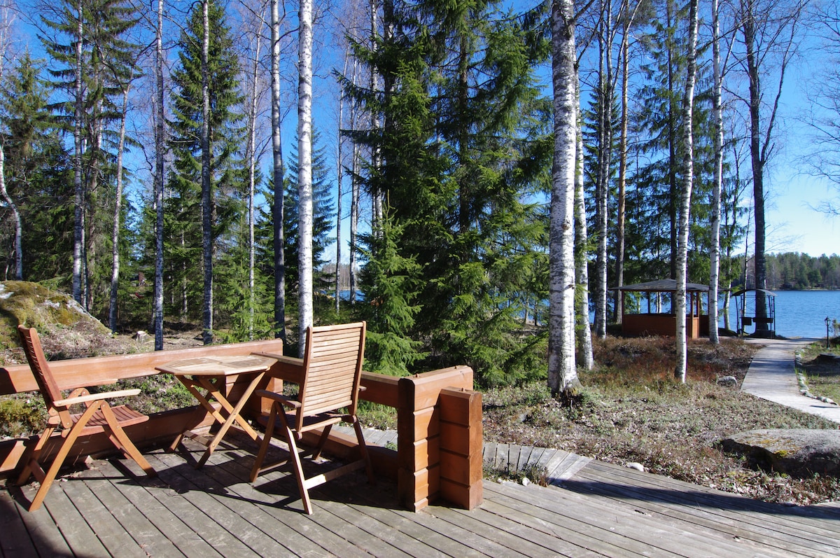 Our piece of land is located on Kaita Järvi– an about 8 km long and a few hundred meter wide lake – it is a small peninsula that looks to the south. That means: sun from morning to evening (if it shines). There right on the shore you find our log cabin, with sauna, bathroom, living room with open kitchen and two small bedrooms. A few meters next to it is a studio like guesthouse, the "Aita". It is also very cosy and comfortable, but provides no own bathroom. Village Savonranta is 5 km away.