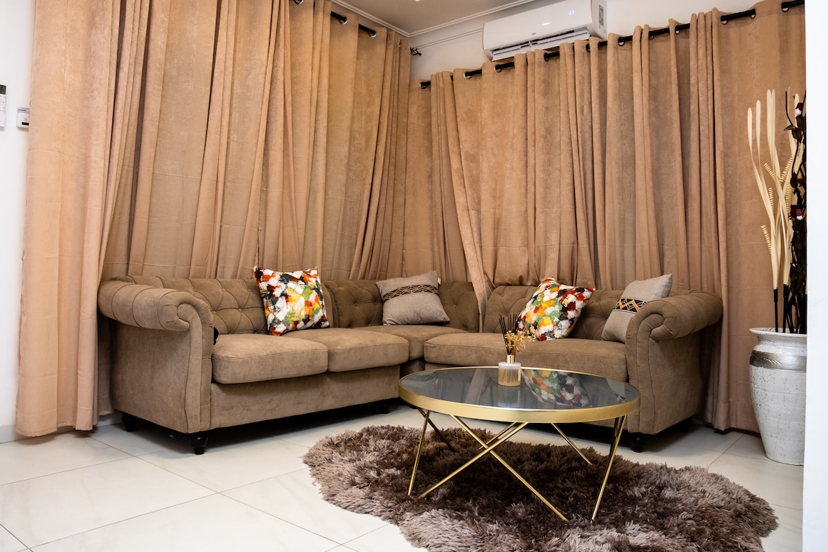 Relájate en este sereno y elegante apartamento de un dormitorio con cocina de planta abierta y sala de estar. Ofrece todo lo necesario para una estancia cómoda y proporciona una escapada tranquila desde el centro de Accra. A solo tres minutos en coche del City-Escape Hotel y a cinco minutos de la playa de Prampram, es perfecto para trabajar a distancia o para una escapada con tu pareja o amigos. Este espacioso apartamento independiente está totalmente amueblado con los últimos electrodomésticos y servicios.