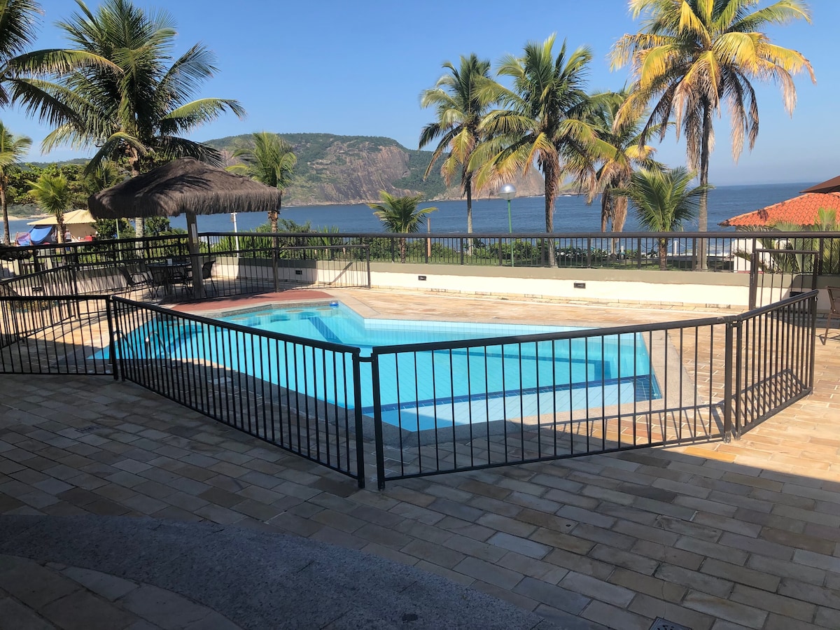 Apt composto de suíte, sala com sofá cama, lavabo, cozinha americana, lavanderia e varanda. Acomoda confortavelmente 4 pessoas, arejado, condomínio luxuoso com lazer completo - Foto em frente a Praia de Camboinhas, acesso interno à areia da praia.Ótima localização, bairro tranquilo com facilidades comércio, segurança interna condomínio, vaga garage. A piscina e as demais áreas de lazer estão abertas.