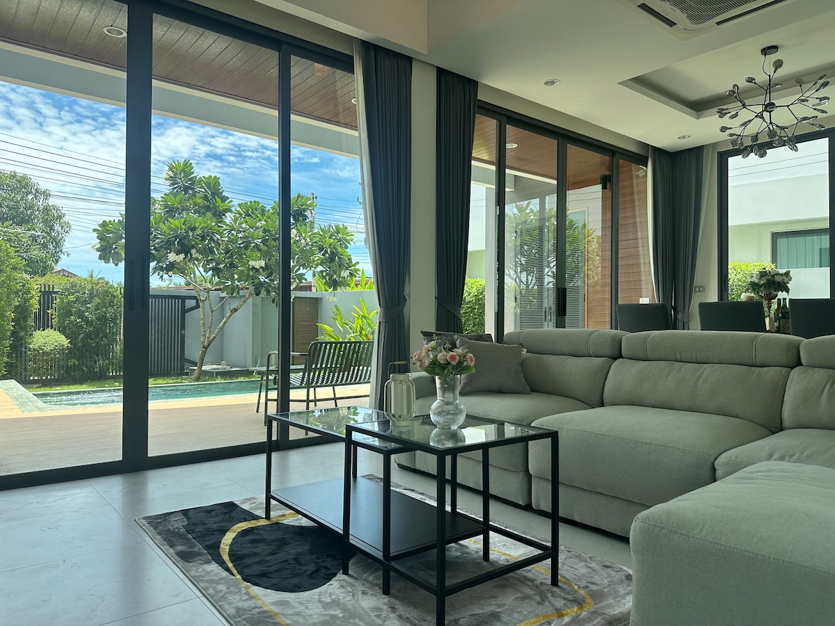 🌿 Tu elegante escapada a una villa con piscina. -3 habitaciones 3,5 baños (camas tamaño king) - Baños privados en la habitación -Utilidades incluidas - Piscina con spa. - Limpieza de la piscina (2 veces por semana). - Wifi (alta velocidad) - Televisores inteligentes (en todas las habitaciones) - Cortinas Blackout -Lavadora/secadora -Cocina equipada - Barbacoa (500 THB) -Toallas frescas. - Champú/acondicionador/jabón -7-11 y Lotus cerca - A poca distancia en coche de la playa de Jomtien (20-25 min) ❤️ Perfecto para vacaciones familiares, escapadas románticas y estancias largas. ⭐️Precio especial por semana y por mes Reserva ahora❗️