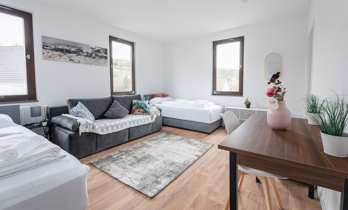 Für Geschäftsreisende, Alleinreisende, Freunde, Familien! Auf ca. 110m² erwartet dich eine riesige Wohnfläche mit 2 Schlafzimmern, 1 großen Küche, 1 Esszimmer, 2 Bäder mit 2 Duschen, 2 WCs, 1 riesiger Balkon, 2 Sonnenliegen und Balkonmöbel + 1 extra Hobbyraum! Privater diskreter Eingang, freies Telekom WLAN. Gepflegtes Grundstück, alarmgesicherte Wohnung. Frische Bettwäsche, Hand-, Bade- und Geschirrtücher vorhanden. 24-Check-in hier möglich!