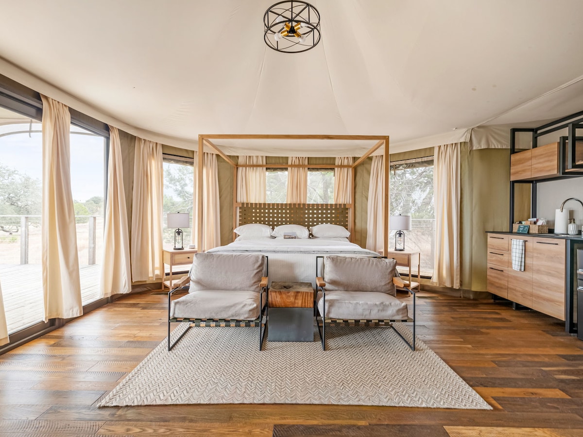 ¡Disfruta de la naturaleza en un entorno lujoso y climatizado enclavado en hermosos bosques de pinos! Nuestra tienda safari está equipada con todo lo necesario para relajarte y desconectar. Date un baño en la bañera con patas, disfruta de un libro en el porche delantero y duerme plácidamente en la acogedora cama tamaño king. ¡Pinehaven te proporcionará una experiencia de glamping inolvidable! Situado a unos 20 minutos de Round Top, Texas.