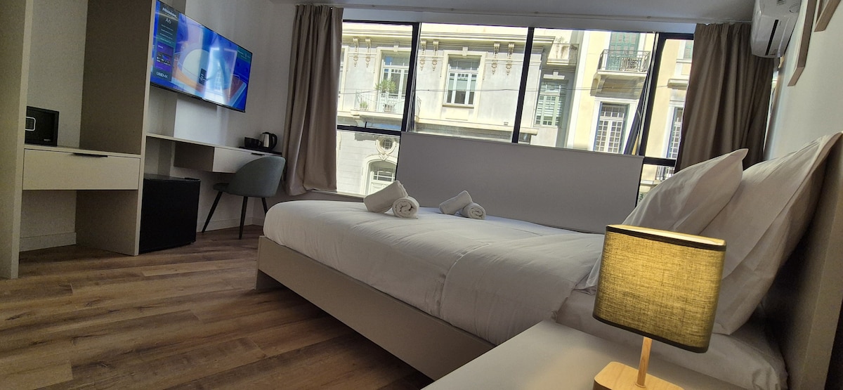 Una habitación luminosa y cómoda con un diseño limpio y moderno y tonos neutros suaves, que ofrece una estancia acogedora en el corazón de Atenas. Disfruta de una cómoda cama doble, suelos de madera, un moderno baño con ducha, aire acondicionado, conexión wifi gratuita y una nevera para tus artículos esenciales. Los grandes ventanales enmarcan las vistas a la ciudad y llenan la habitación de luz natural. Comienza el día con un café de cortesía en el vestíbulo y termínalo en la azotea con vistas panorámicas y un relajante jacuzzi.