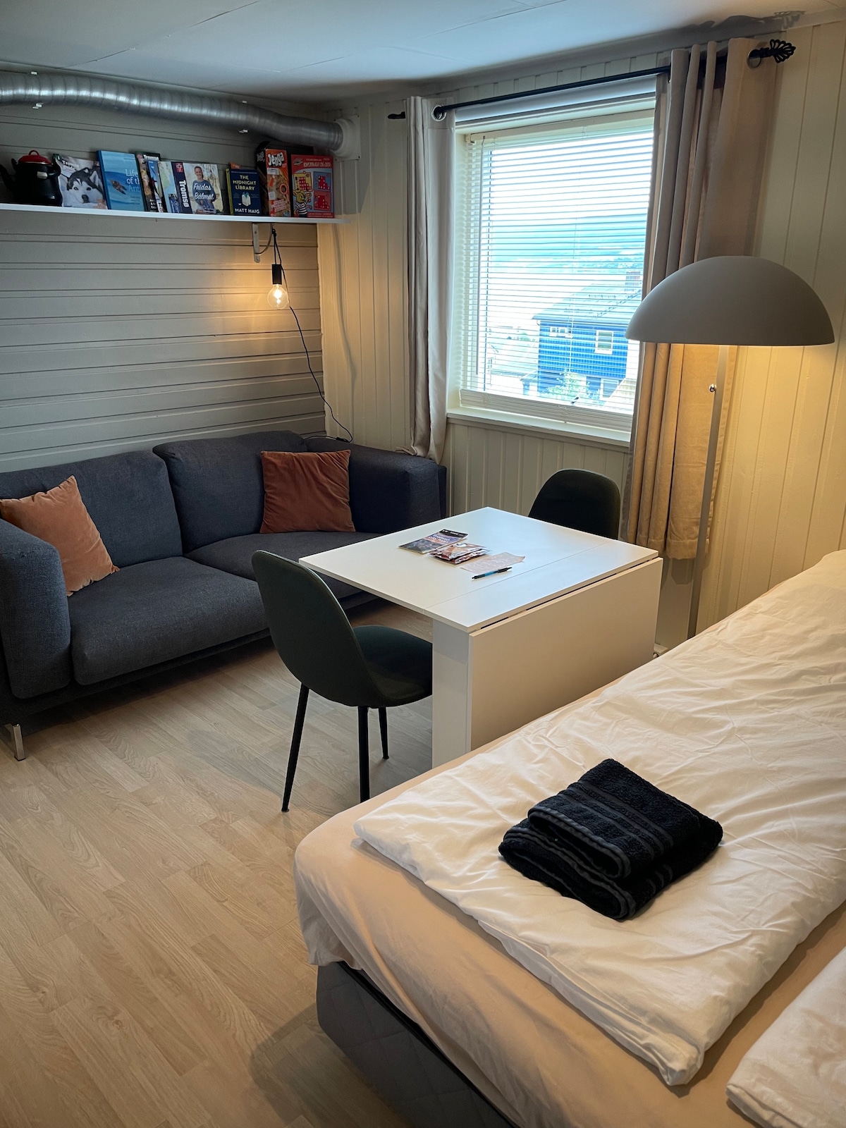 Centro de la ciudad a 25 minutos a pie, parada de autobús cercana que va al centro de la ciudad/aeropuerto/universidad. Aeropuerto a 5 minutos en taxi. Tienda de comestibles a 5 minutos a pie. El estudio contiene un dormitorio/baño/cina. TV, cromecast, wifi. Vista de la aurora boreal desde la habitación. Te encantará mi alojamiento, ya que es privado, moderno, limpio y cómodo. Situado en un entorno tranquilo con montañas fiordo, sol de medianoche y aurora boreal. Mi casa es ideal para solteros, parejas/familias de vacaciones o de negocios.