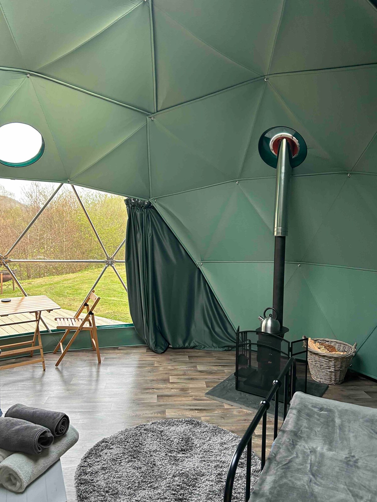 La cúpula cuenta con todo lo necesario... ¡acampada de lujo en su máxima expresión! La cúpula incluye... Cama king size con edredón y ropa de cama de lana galesa, toallas grandes y toallas de mano, cómoda para guardar toda tu ropa, tragaluz (puedes tumbarte en la cama y ver las estrellas), 2 bolsas de agua caliente, colcha, varias mantas para abrigarte por la noche, lámpara recargable. La cúpula no tiene electricidad ni calefacción. En una choza privada, a 2 metros de la cúpula, se encuentran la cocina, la ducha eléctrica y el inodoro.