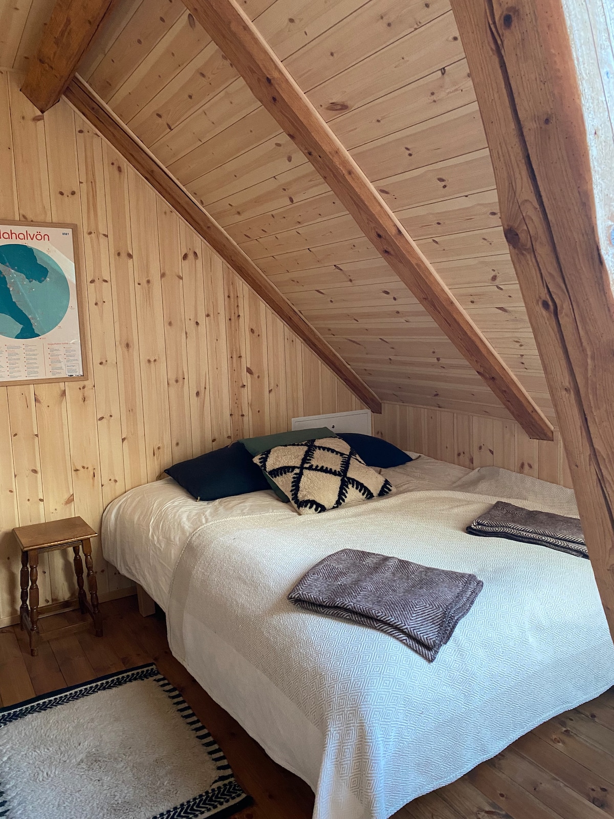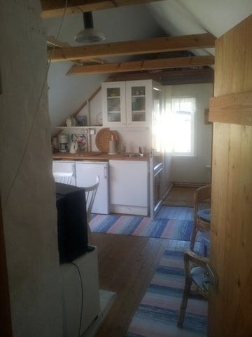 En nuestra granja vecina Valla Gård ahora puedes alojarte en el "Loft", un apartamento decorado en el antiguo loft de grano del establo. Aquí, el estilo es un poco inspirado en Aspen con paredes de madera nuevas acristaladas marrones, mientras que una pared a dos aguas se ha permitido mantener sus tableros originales. También se conserva la antigua escalera de grano, lo que hace que el dormitorio principal de arriba sea menos adecuado para niños pequeños, pero muy acogedor para cualquier persona que tenga una escalera más empinada. 2 dormitorios con espacio para un máximo de cinco personas, cocina privada, baño y sala de estar.