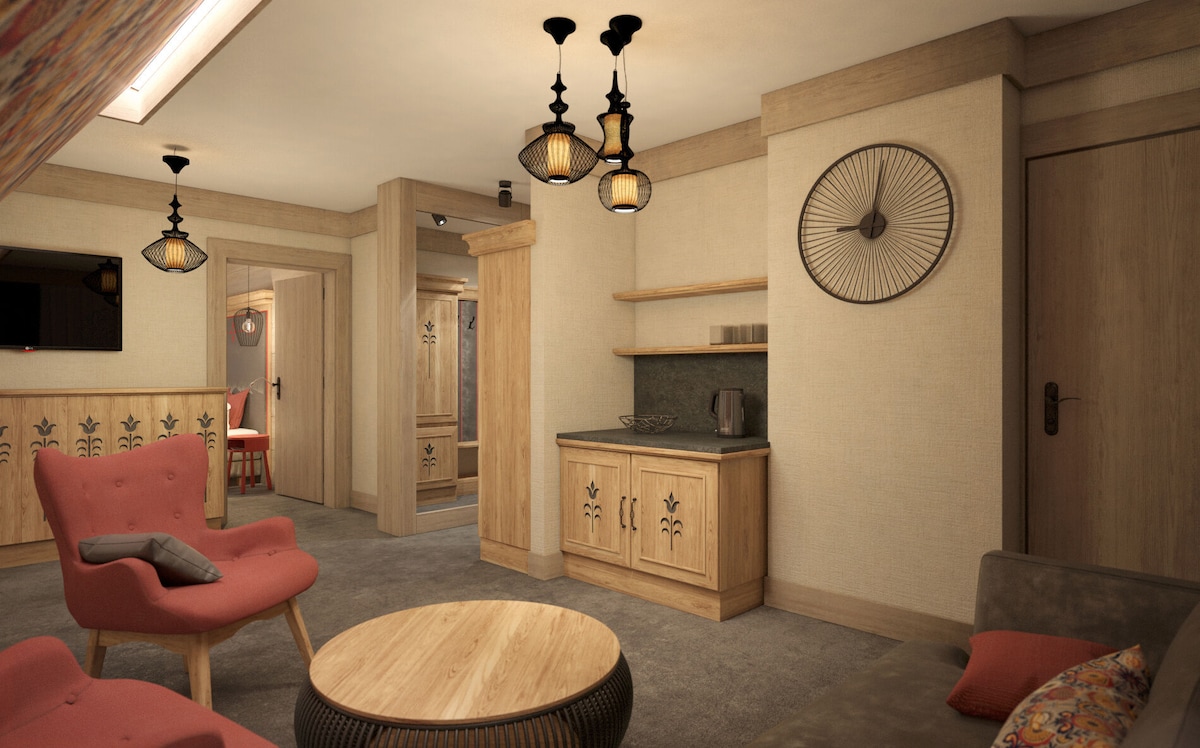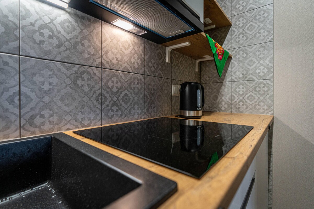 Luksusowy apartament w centrum miejscowości Ząb w pobliżu Zakopanego z widokiem na góry. Apartament posiada balkon z stolikiem i 2 krzesłami. Apartament wyposażony jest w elektryczny system ogrzewania oraz klimatyzację. W łazience znajduje się prysznic z odpływem liniowym, suszarka do włosów, zestaw kosmetyków, ręczniki i stopka. Apartament posiada aneks kuchenny wyposażony w: lodówko zamrażarkę, czteropalnikową płytę indukcyjną, czajnik, naczynia, sztućce, garnki.