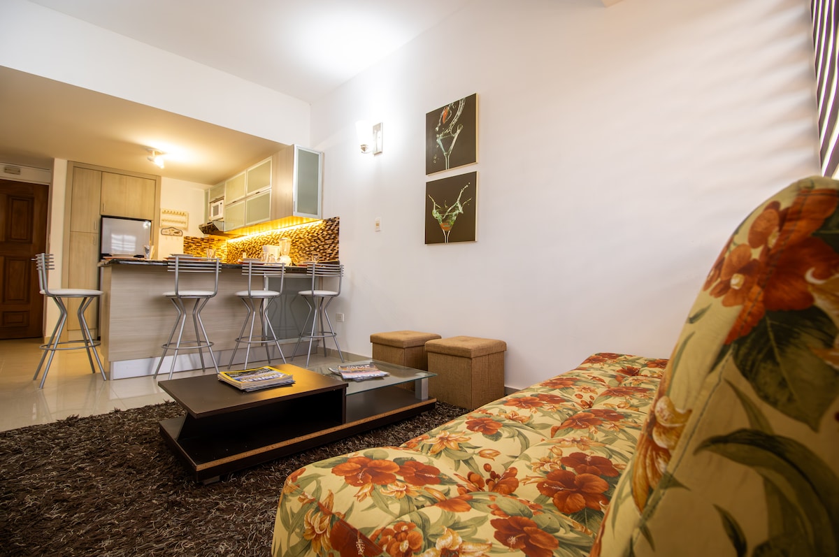 Este apartamento está en mezanina, solo hay que subir 5 escalones y llegas al apartamento, es para 2 personas más 1 adicional ya que cuenta con sofá cama, se encuentra a pasos de la playa, tiene una ubicación genial, ¡será muy fácil planear tu visita! Cuenta con 1 habitacion y 1 baño, tiene agua las 24 horas del día ya que el conjunto cuenta con pozo subterraneo, aire central, tienes tostadora, airfrayer, mini hornito. Querrás venir una y otra vez. super recomendado.