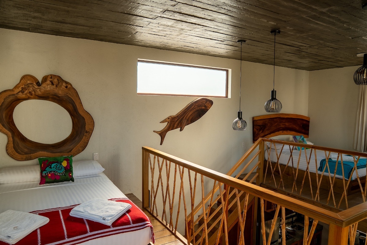 Cabaña estilo Loft con vista al océano, diseño al interior de doble altura con mezanine para las dos camas y privacidad, lo más increíble son las vistas del atardecer, el bosque, por las noches disfrutar de las estrellas y los sonidos naturales del mar por las noches que hace cómodo y agradable el lugar para disfrutar en pareja o familia de una estancia diferente a lo acostumbrado y relajarte rodeado del campo. Baño completo, cocina, comedor, palapa, hamaca, aire acondicionado, tv, WiFi.
