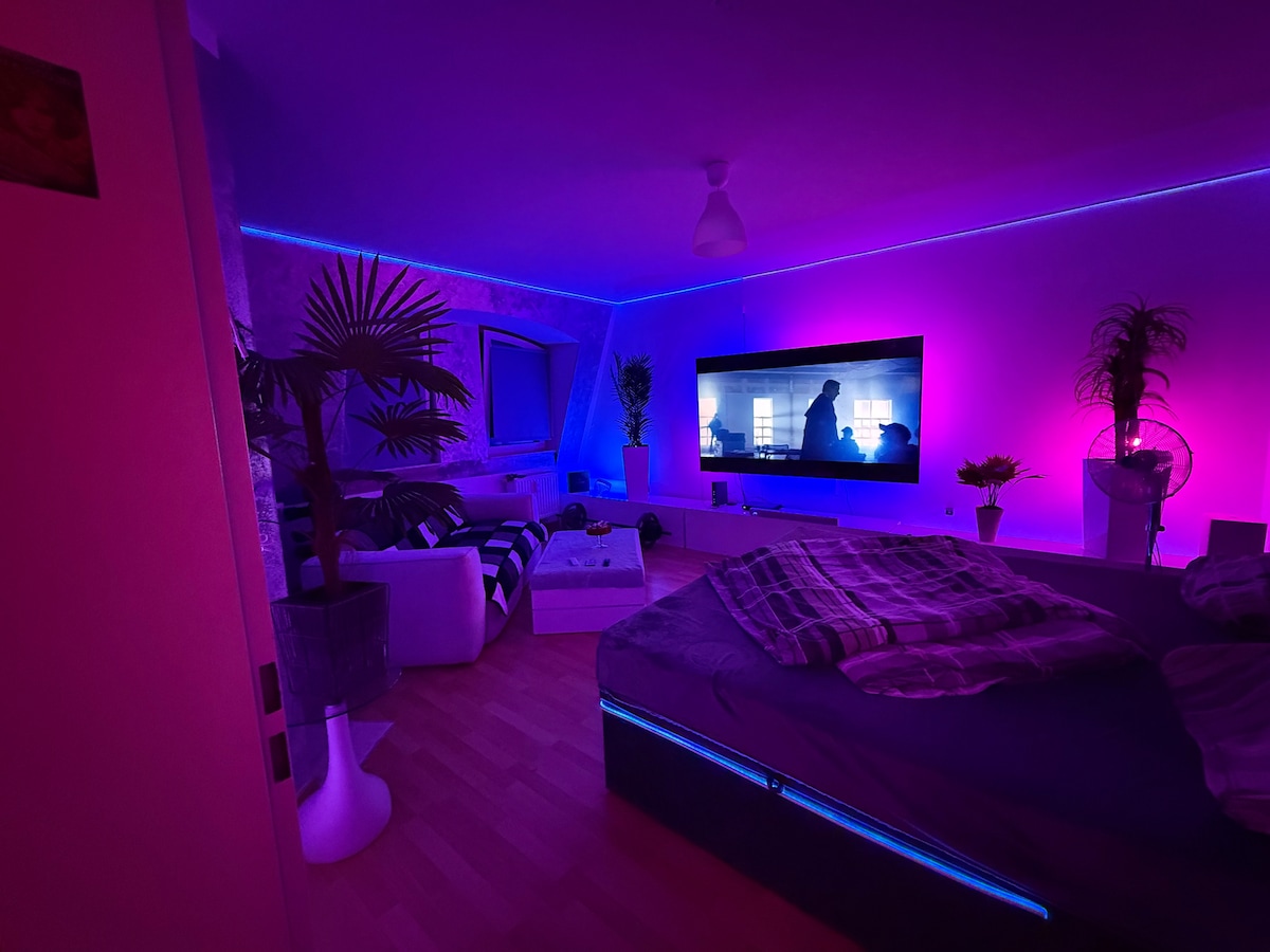 Siéntate y relájate en mi alojamiento dúplex decorado con cariño en una casa completamente renovada con calefacción por suelo radiante. Se encuentra en una casa adosada en el 1.º piso con su propia cocina abierta y un baño con ducha. La casa está bordeada por una terraza recién terminada, un gran jardín con mucha vegetación (actualmente en proceso de renovación), una piscina de 4 x 8 m con opciones de asientos y descanso. La zona exterior de la piscina también tendrá un nuevo aspecto el próximo año.