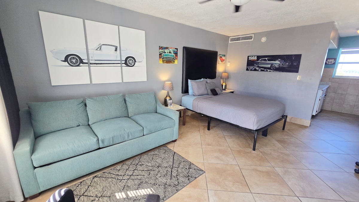 Somos uno de los Airbnb más cercanos al paseo marítimo, en la playa más famosa del mundo, con una piscina abierta. Televisor de 65 pulgadas Ven a disfrutar de nuestro estudio recién amueblado con increíbles vistas a la playa desde la planta superior. Somos el AIRBNB en la playa más cercano al Circuito Internacional de Daytona Con cama king y sofá cama tamaño queen. Ubicado en el centro de Daytona Beach, a poca distancia a pie del paseo marítimo del muelle, restaurantes y la calle principal. Tenemos aparcamiento GRATUITO para 1 vehículo y ofrecemos café, crema, azúcar y sillas de playa.
