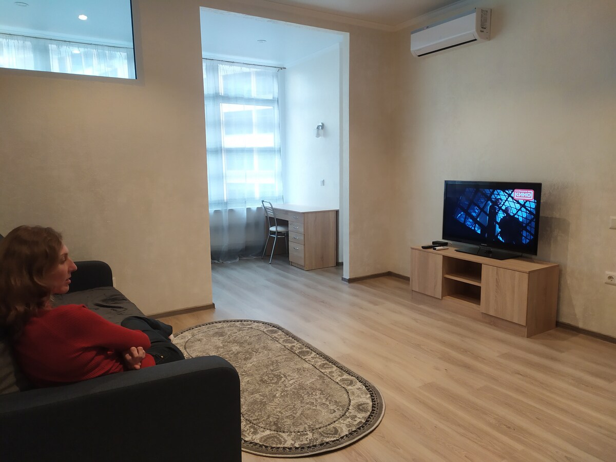 Уютная квартира с двумя отдельными спальнями и гостиной, совмещенной с кухней. В гостиной зоне удобный, раскладывающийся двуспальный диван. Кухня полностью укомплектована всем необходимым для комфортного проживания. В ста метрах от дома находится большой и красивый Парк Победы. В 20 минутах пешком находится один из самых популярных пляжей города -Дельфин. Район имеет развитую инфраструктуру и хорошую транспортную развязку. В квартире быстрый Wi-Fi, сигнализация, парковка рядом с домом.