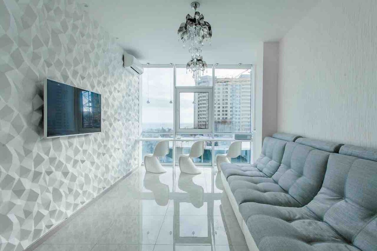 A very stylish designer apartment with an amazing city and sea view that can be enjoyed from the open terrace. Equipped with modern technology and good quality furniture. 20 minutes walk from the beach. For those with good taste and appreciation for nice things. Стильна квартира з дизайнерським ремонтом з чудовим видом на місто та море. Оснащена сучасною технікою та якісними меблями. 20 хвилин пішки до пляжу. Для тих, хто має гарний смак та цінує красиві речі.
