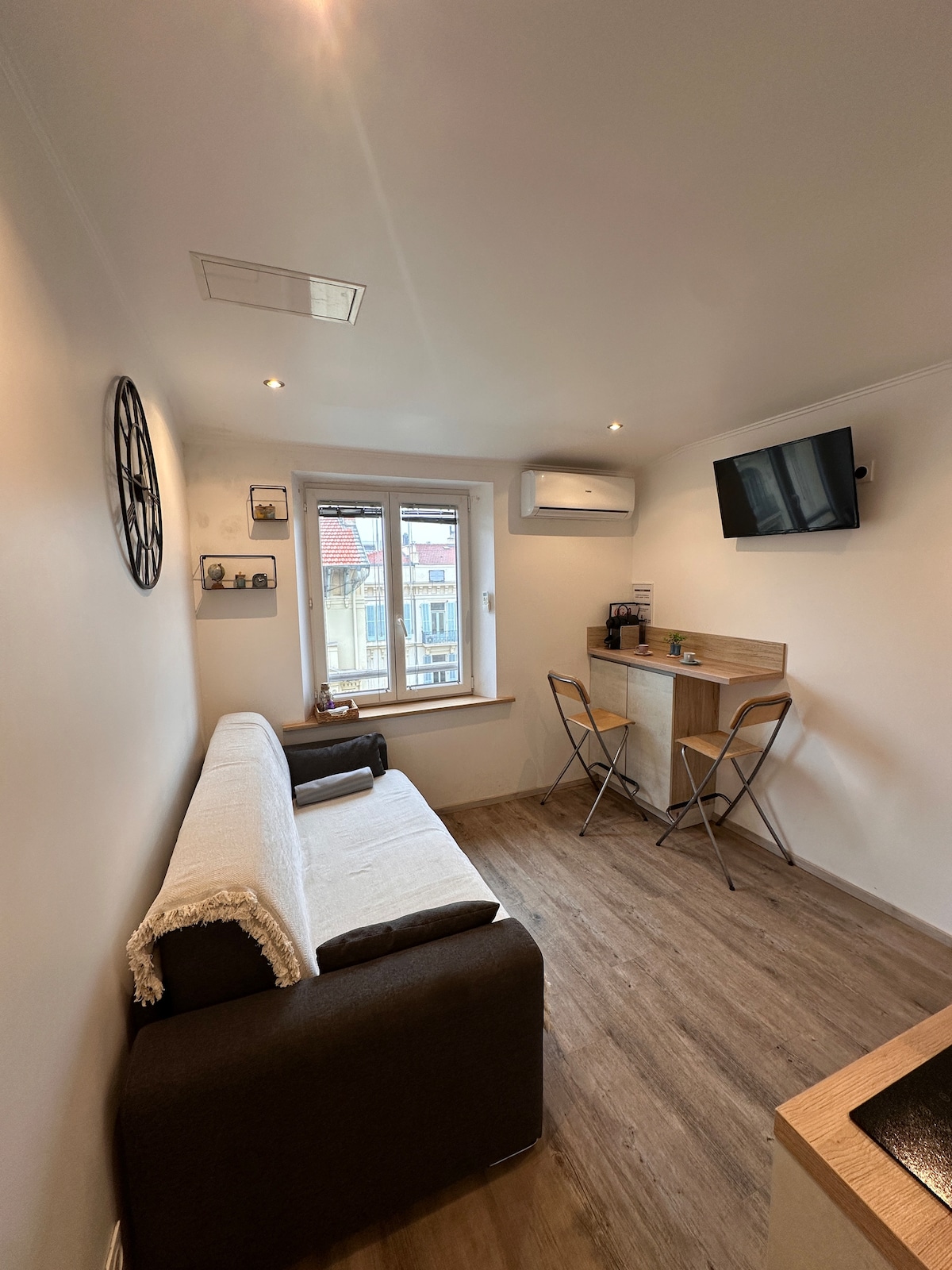 Encantador pequeño estudio reformado con buen gusto, ideal para descubrir Niza a pie. Situado a dos pasos de la plaza Masséna y del casco antiguo de Niza, ofrece todo lo necesario para una estancia agradable: aire acondicionado, cocina equipada, ambiente moderno y acogedor. Perfecto para mentes jóvenes y dinámicas a las que les gusta moverse y disfrutar de la ciudad. 5.ª planta sin ascensor — ¡un poco de cardio, mucho encanto!
