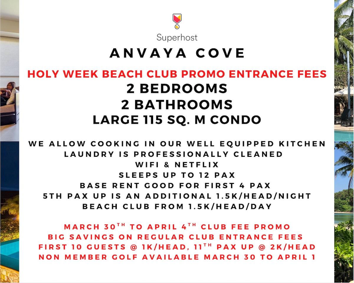 I’m a Superhost with 700+ reviews ✓ We live at Anvaya ensuring your stay is seamless ★ Super clean unit with professional laundry ★ Cooking Allowed ★ WiFi/Netflix ★ Base rate good for up to 4 pax ★ Additional pax @ 1.5k/head/night ★ Beach Club entry from 1.5k/head/day - only paid on days you actually enter the club ★ Beach Club now managed directly by Ayala Hospitality ★ New Head Chef who trained at Enderun ★ Makes a great base to also explore Zoobic Safari, Ocean Adventure & Las Casas Filipinas
