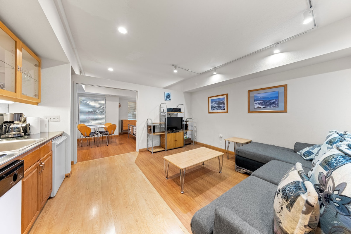 Ubicación perfecta para el verano con vistas a la plaza de eventos y al esquí, comodidad de salida de esquí en invierno. Imagina, empapándote de los rayos de tu balcón, con asiento de primera fila para todos los entretenimientos y actividades a continuación. O mantente caliente en invierno junto a la acogedora chimenea interior. Encantador apartamento de 1 dormitorio con todo lo que necesitas. Muebles e iluminación recientemente renovados. Baja las escaleras a los restaurantes, tiendas, eventos y góndola. El apartamento tiene 1 cama tamaño king en el dormitorio y 1 sofá cama extraíble en el salón.