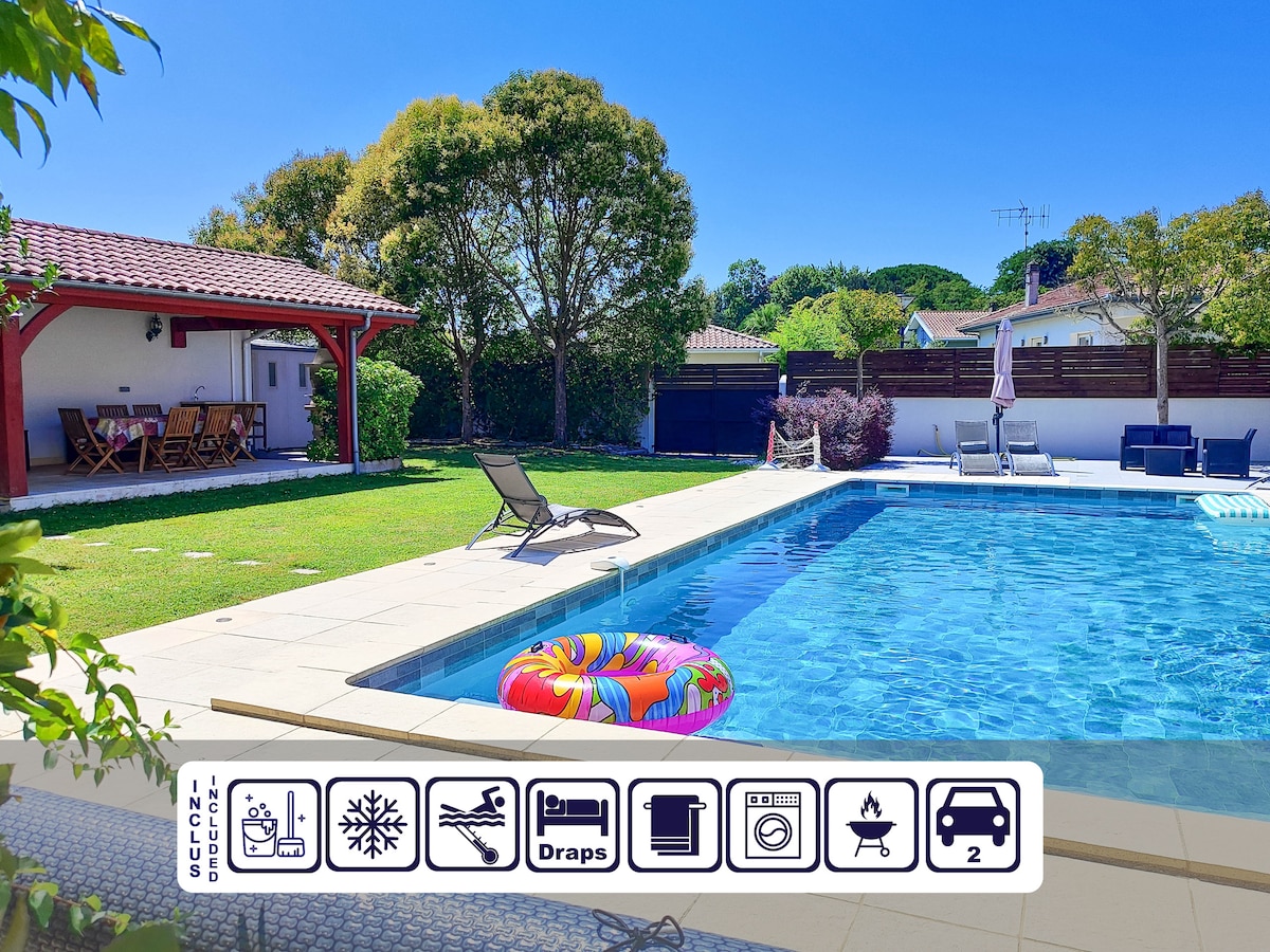 Bienvenido a una casa pensada para los buenos momentos: - grandes espacios interiores acondicionados, - un gran jardín seguro para jugar y relajarse, - una piscina climatizada (de mayo a octubre) para disfrutar del sol de la mañana a la noche, - el bosque al otro lado de la valla. Un espacio para estar realmente juntos. La casa está perfectamente situada entre las Landas y el País Vasco a menos de 10 minutos de la playa y a 20-45 minutos de los lugares imprescindibles. ¡Se admiten perros, buena vida asegurada!