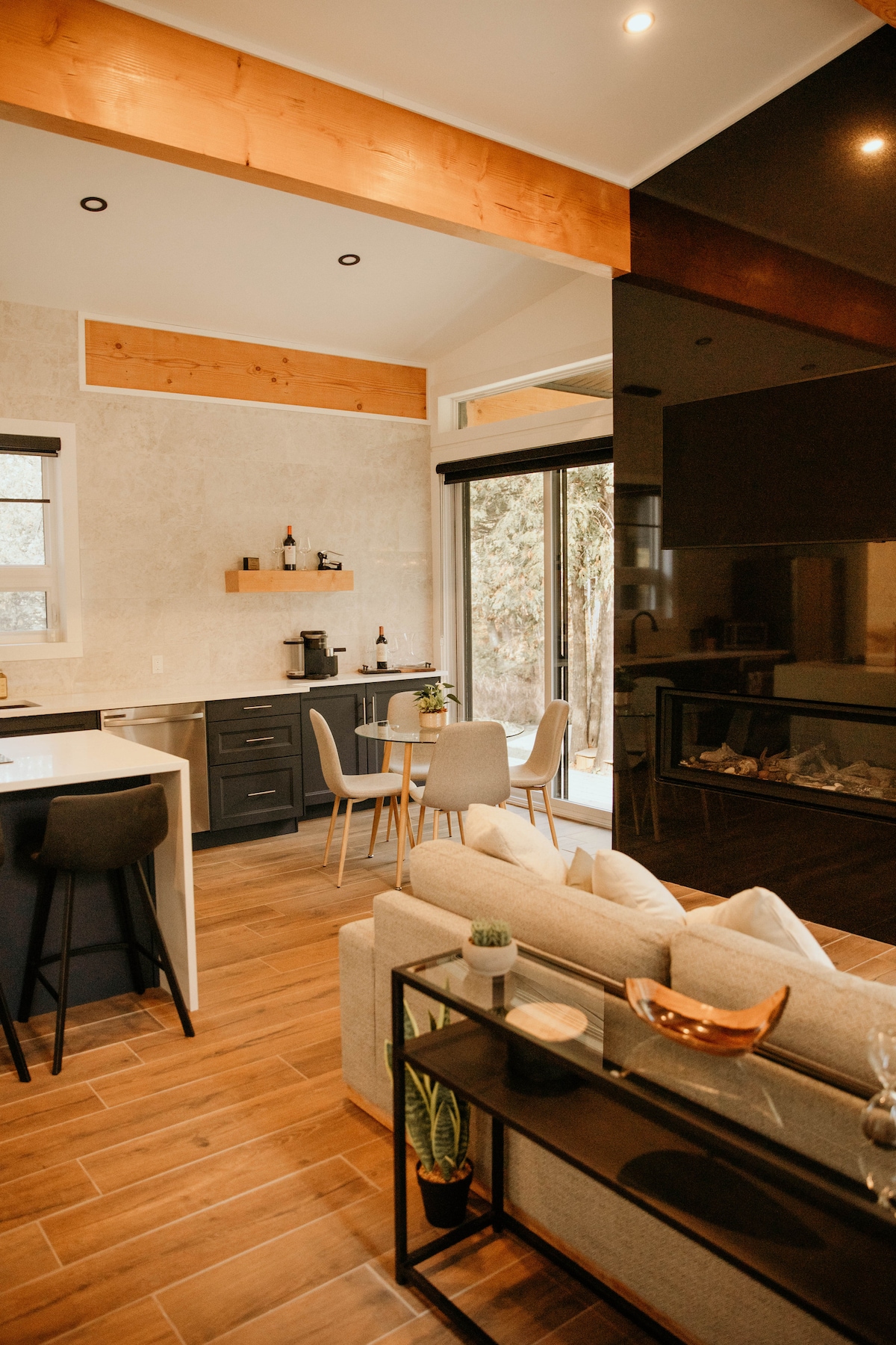 ¡Te damos la bienvenida a La Khabine! Esta acogedora y moderna cabaña viene con todo lo necesario para relajarse y conectarse con la naturaleza. Disfruta de una copa de vino con el sonido de un fuego crepitante en la chimenea de leña. Contempla las vistas al bosque a través de los ventanales que rodean el suelo hasta el techo. Relájate en la sauna privada de barril de cedro al aire libre. Los productos naturales para el cuidado personal, la leña, el jabón de lavandería y el wifi de alta velocidad son gratuitos. Esperamos que te guste nuestra pequeña cabaña de ventanas tanto como a nosotros :)