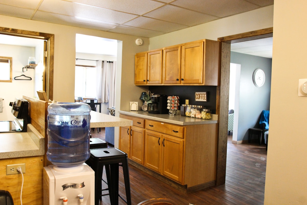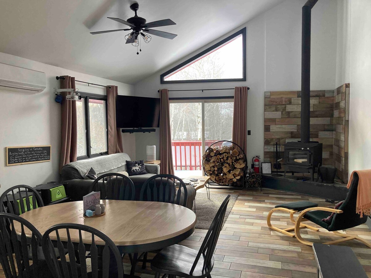 Apartamento completo con una cama tamaño queen en el dormitorio y un sofá cama en la sala de estar. Tiene capacidad para alojar cómodamente a 4 personas. También tienes acceso a una cocina completa. ¡Disfruta de la estación de esquí Snow River y de las rutas para motos de nieve a pocos metros de la propiedad en invierno o practica senderismo por las montañas Porcupine y otras actividades al aire libre en verano! Por el momento, no admitimos mascotas.