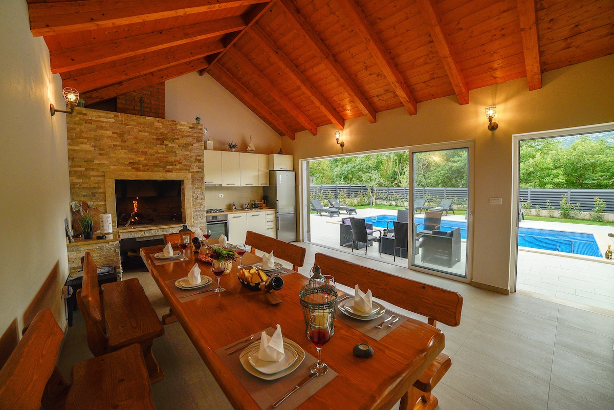 ¡Toda la villa solo para ti! VILLA ROMÁNTICA ubicada en un lugar verde ytranquilo, Dugopolje Nada en UNA PISCINA CLIMATIZADA yrelájate en el JACUZZI con jacuzzi Ponte al sol y escucha el sonido de la fuente Barbacoa bajo un cenador Trampolín, futbolín, dardos, 5 bicicletas, ¡TODO PARA TI! Genial, todo está cerca: Salida A1 autopista: 3 km PLAYA llamada ŽNJAN-15km City SPLIT: 16 km Puerto de transbordadores de SPLIT para visitar las islas BRAČ, HVAR, VIS-19km Antigua Salona a 9 km FORTESSA KLIS (Juego de Tronos) - 6 km Perfectamente cerca,pero lo suficientemente lejos para su paz y privacidad Disfruta de tus vacaciones