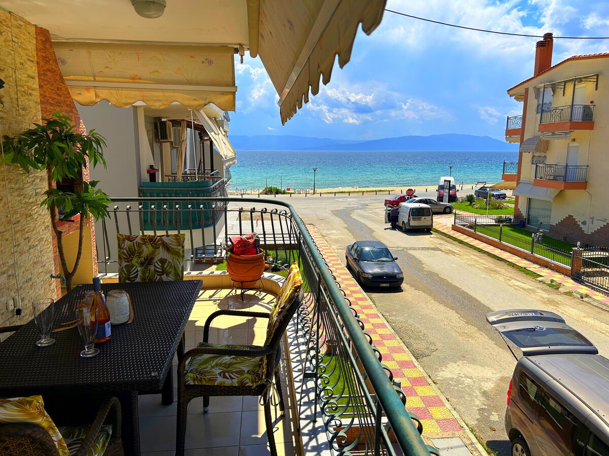 Un bonito apartamento, a solo 10 minutos a pie y a 2 minutos en coche del centro de la ciudad. A 50 metros de la playa y a solo 1 minuto a pie. Espectacular vista del mar y la montaña “Paggaio”. ¡Supermercado, restaurantes, farmacia y todo lo que necesitas están muy cerca!