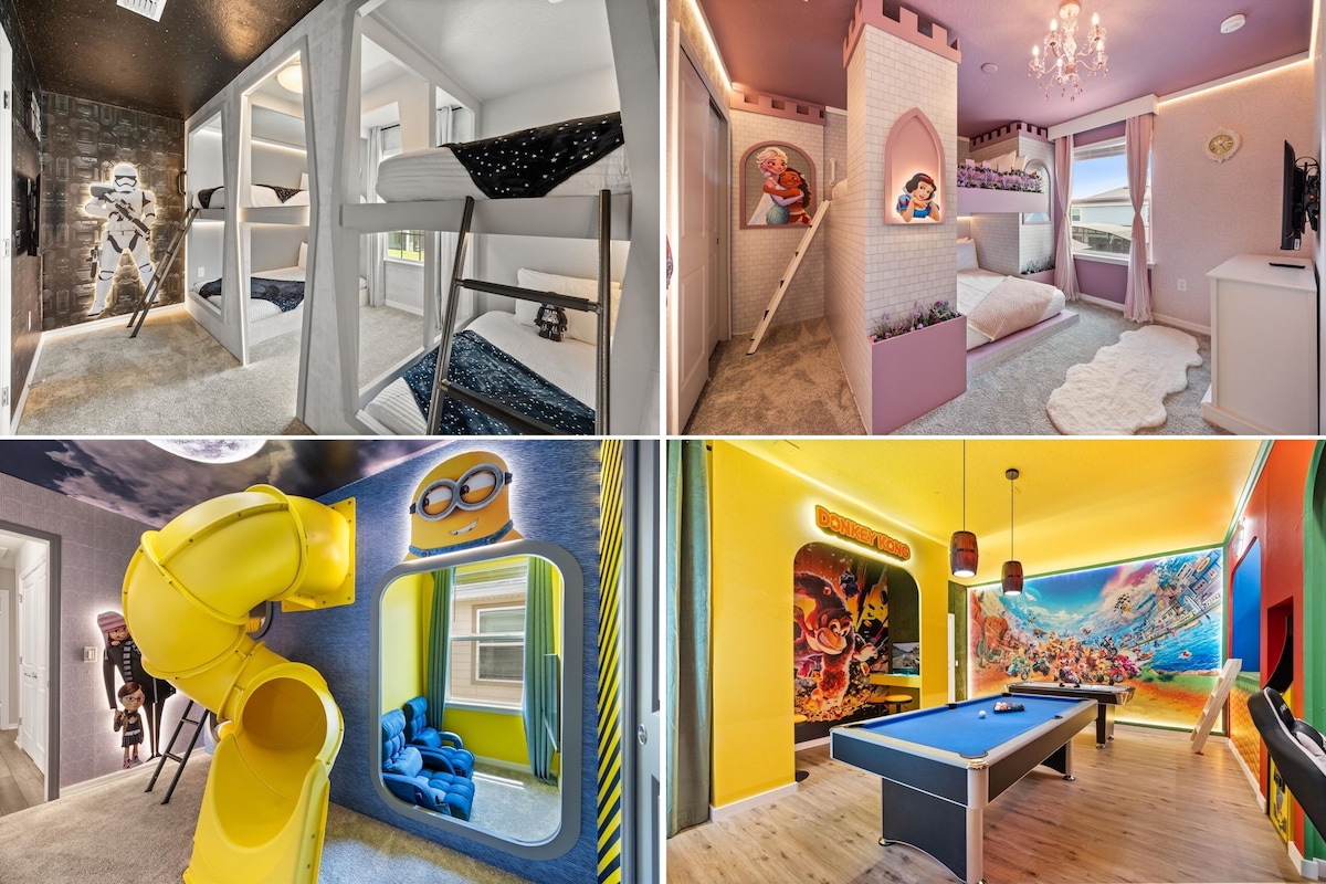¡Vive la magia de Disney en nuestra villa de lujo! ¡Barbacoa incluida! ¡Estación de carga Tesla/EV! ¡Piscina climatizada gratis! Nuestra casa privada con piscina única de 8 dormitorios y 5 baños está meticulosamente limpia y recién reformada. ¡Cocina recién remodelada y habitaciones temáticas, y espacios ricamente equipados que incluyen grandes áreas de reunión, una cocina luminosa de calidad profesional, un comedor espectacular, 2 suites principales a pie, un cine en casa y una estación de carga Tesla/EV! Piscina y spa relucientes. A solo 15 millas de Disney.