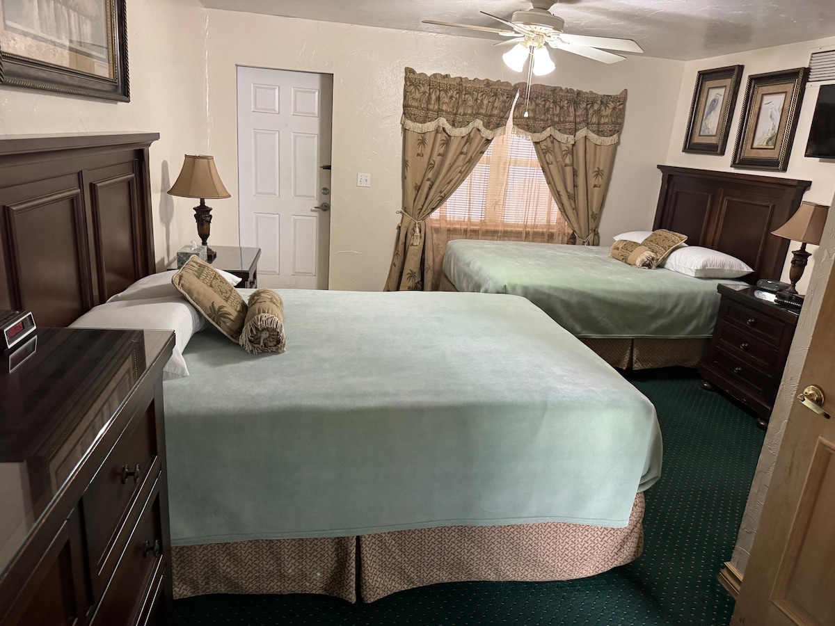 Room 14A-Sierra Suite is a 1 bedroom 1 bath suite that overlooks our beautiful courtyard. Suite has 2 queen beds and full bath. On property beach access and outside shower so after a day at the beach come relax by our beautiful pool or play a friendly game of shuffleboard. Grills onsite for those bbq lovers and plenty of table, chairs and loungers to just hang out and enjoy the ocean breezes
