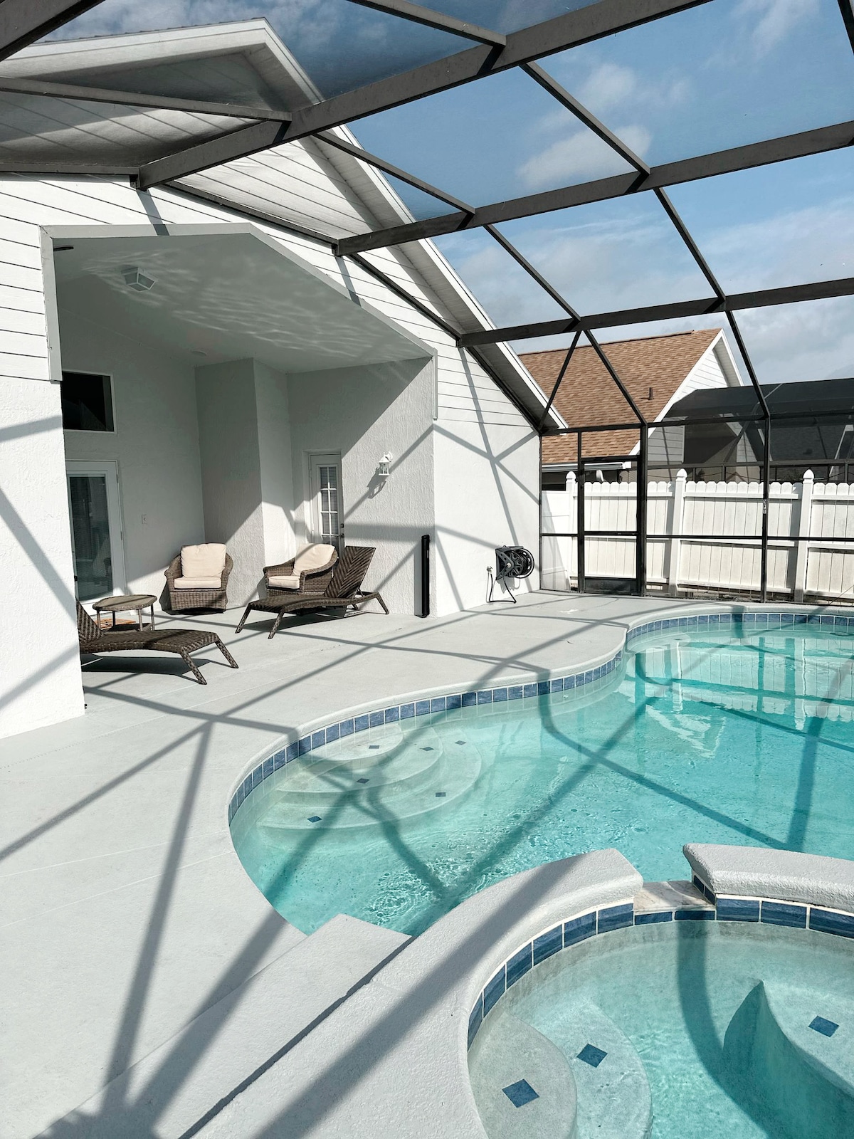 En este alojamiento se respira tranquilidad: ¡relájate con toda la familia! Casa con piscina de 3 dormitorios y 2 baños totalmente renovada, espaciosa y moderna en más de 2 acres en Saint Cloud. A pocos minutos de la autopista de Florida y de la autopista 192 en vehículo, fácil acceso a parques temáticos, parques acuáticos y al aeropuerto. Tiendas de comestibles, tiendas y restaurantes están a pocos minutos de casa. Totalmente asegurado con valla, cerradura de puerta, cerradura inteligente de puerta principal, cámaras de seguridad, etc. Televisores inteligentes en todos los dormitorios y en la sala de estar.