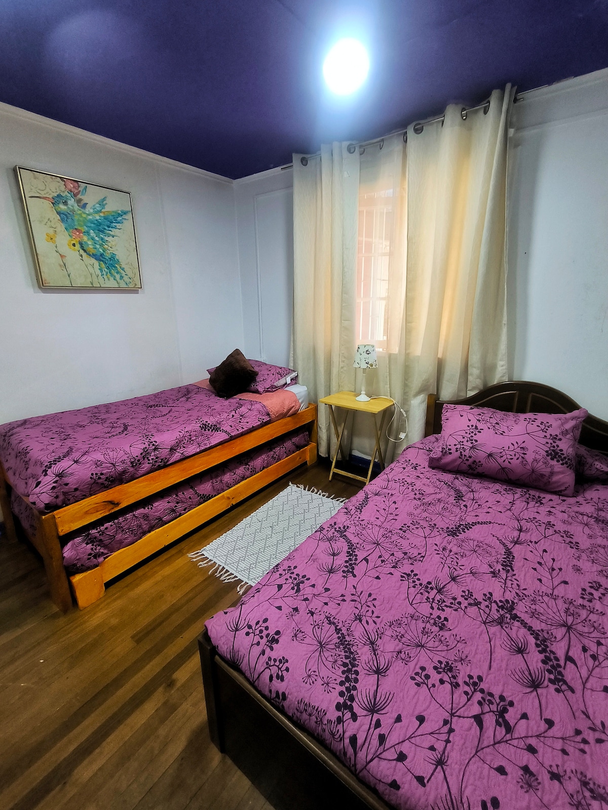 Si estás de vacaciones es un excelente lugar para alojar. 2 dormitorios con 2 camas cada uno, baño privado, patio amplio para descansar, comer algo rico, leer y disfrutar del jardín. Incluye desayuno con productos de la zona. Tenemos servicio extra de lavandería y almuerzo. Queda a pasos de la carretera y al lado de un supermercado grande. Un barrio seguro y excelente ubicación, puedes disfrutar de caminatas en la noche.
