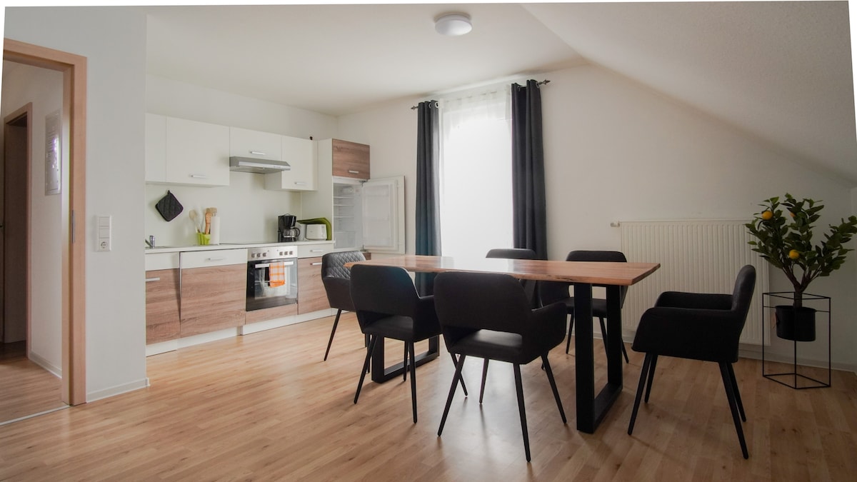 Disfruta de momentos únicos en nuestro lujoso ático en las azoteas de Obersulm. Te espera una combinación de comodidad moderna y celosía. Pura relajación y relajación. Disfruta del baño XXL, 2 baños y la gran terraza de la azotea. La gran mesa de roble en el salón-comedor abierto te invita a las acogedoras noches y a la moderna cocina totalmente equipada para delicias culinarias. Ponte cómodo en el sofá frente al televisor de 55 pulgadas.