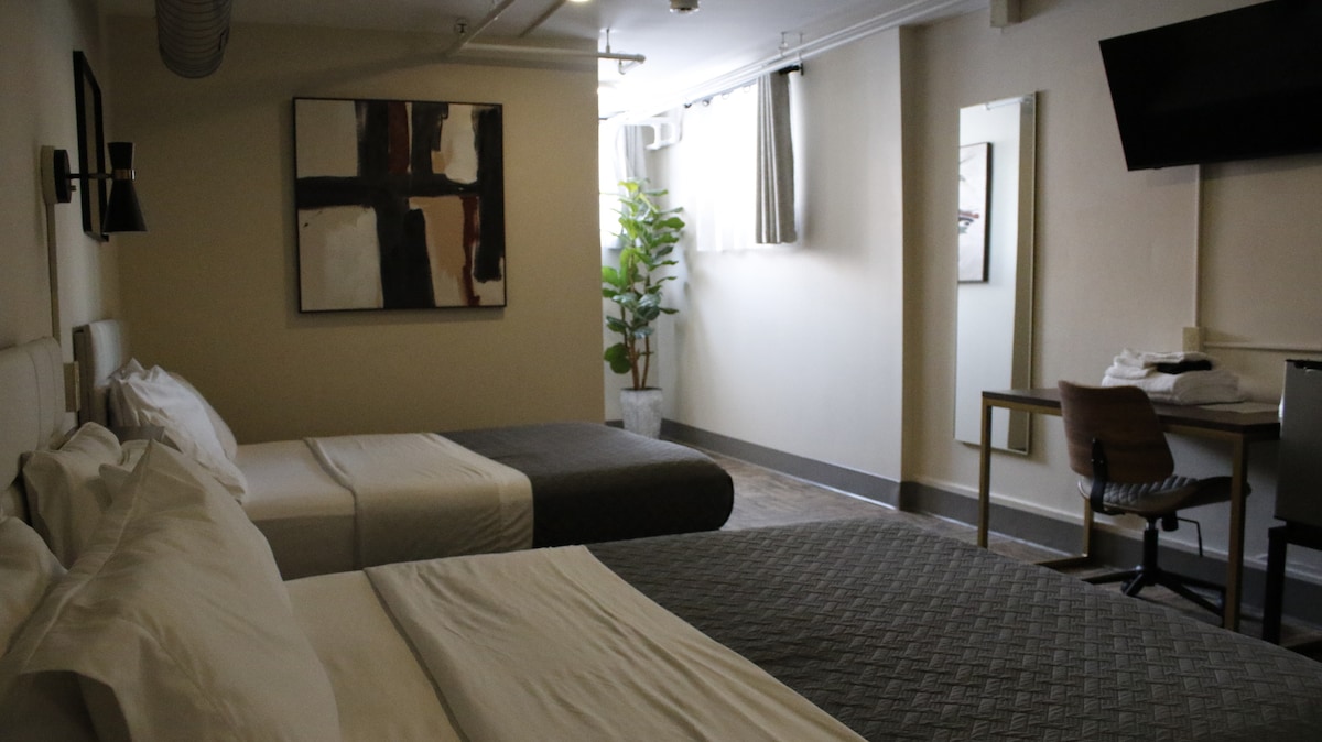 Antes de reservar esta unidad, ten en cuenta que hay un apartamento encima de este con suelos de madera. Si eres sensible al sonido/ruido, es posible que no sea adecuado. Dos camas tamaño queen, un baño privado con ducha y un espacio de trabajo. Esta vivienda está situada en el nivel inferior del edificio. Electrodomésticos: nevera, microondas, cafetera (incluye: café molido, crema de café, tazas de café desechables, paquetes de azúcar, surtido de bolsitas de té).