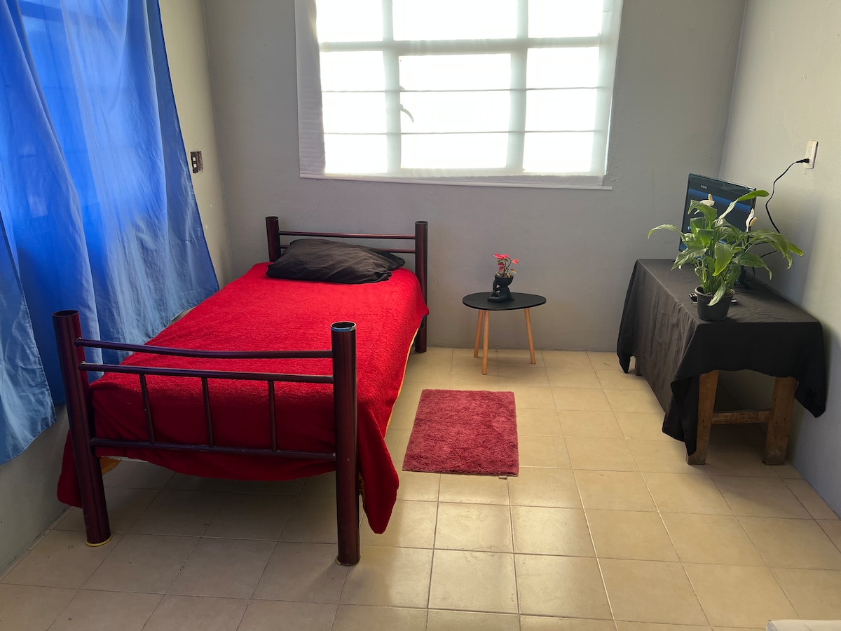 Linda habitación, cuenta con Smart TV, wifi, 1 cama matrimonial y un baño completo al interior de la habitación; Ubicada en una zona residencial muy tranquila y segura, a unos 10 minutos caminando de la central camionera y centros comerciales. La habitación esta dentro de una casa pero es independiente, con acceso directo, cuenta con su propio baño, esta en planta baja y el estacionamiento es sobre la calle. Recepción de mascotas sujeto a disponibilidad.