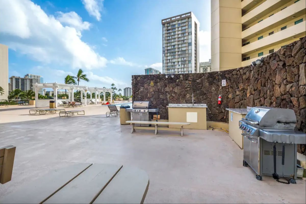 Perfecta escapada de vacaciones, con increíbles vistas de la playa y la laguna de Waikiki. La mejor ubicación, a poca distancia a pie de muchos puntos de interés, Ala Moana Mall/tiendas de diseño y muchos restaurantes! Disfrute de visitar Oahu - hay visitas turísticas, natación, senderismo, surf o compras, etc. ¡Disfrute viendo los fuegos artificiales todos los viernes por la noche desde el patio, patrocinado por Hilton Hawaiian Village! La piscina del hotel también está disponible para nuestros huéspedes. También se aceptan estancias de larga duración con tarifas especiales.