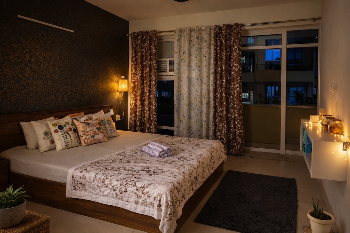 Come, fall in love with the unique charm of this boho-themed apt in Gurgaon. This cozy apt radiates a warm, artistic ambiance that invites relaxation. Location: Located in the bustling high-street of Joystreet, you’ll find an array of culinary delights at the restaurants below, trendy boutiques, local cafes, and a cinema experience at Inox just steps away. Everyone is welcome! ✿ AC is centralised, we cannot change the temperature, the building has all the control.