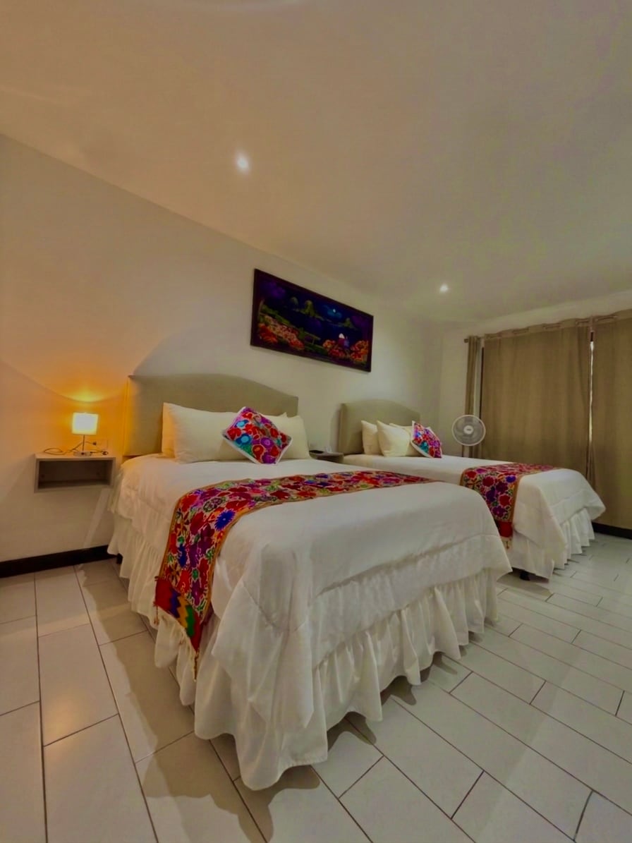 Hospédate en una amplia habitación con dos camas matrimoniales, ideal para 2 a 4 personas. Incluye desayuno gratuito en el rooftop con espectaculares vistas al lago y volcanes. Disfruta de atención 24 hrs, recepción dedicada y espacios modernos diseñados para tu comodidad. La habitación cuenta con cafetera con café y té, agua de cortesía, secadora y baño privado. Perfecta para familias o grupos que buscan confort y una experiencia única en Panajachel.