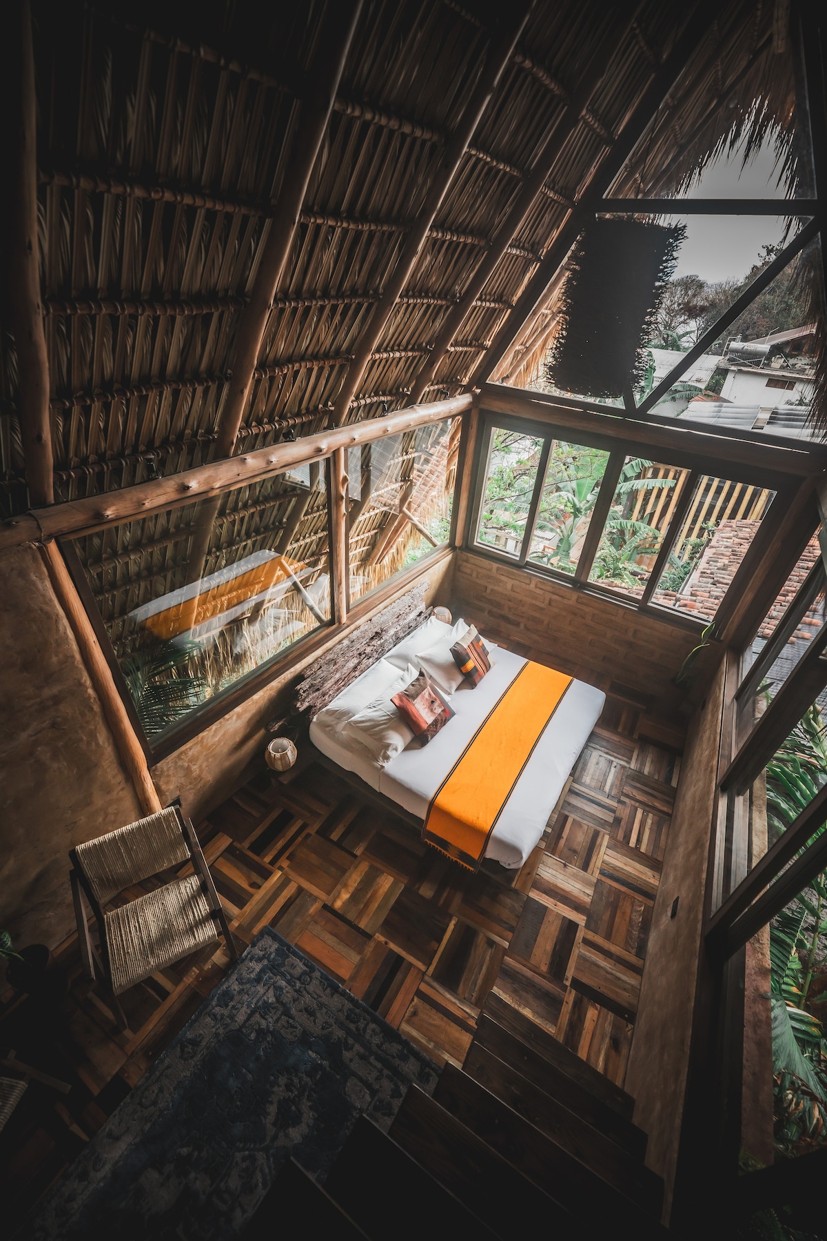 Disfruta de nuestra espaciosa suite, con una cama tamaño king hecha a mano, acabados de lujo y unas impresionantes vistas del lago Atitlán, así como de exuberantes jardines. Despiértate y disfruta de unas vistas impresionantes desde la comodidad de tu cama, mientras que la escalera flotante añade un toque de magia, sumergiéndote en un ambiente tranquilo de bosque nuboso. Con acceso compartido a la piscina, al muelle privado, al jacuzzi, a la sauna, a los jardines y a las cocinas al aire libre, encontrarás el entorno perfecto para la serenidad y el placer.