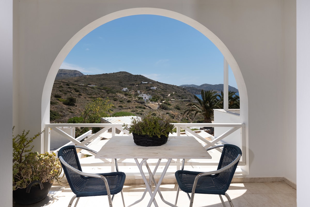 Apartamento de un dormitorio totalmente equipado con vistas frontales al mar. Una cama doble en el dormitorio, cocina totalmente equipada (horno, nevera-congelador, lavavajillas, 4 fogones), baño con bañera, lavadora, terraza privada con sillas y mesa. Acceso a un patio compartido con acceso directo al mar (rocas) donde los huéspedes pueden darse un baño por la mañana. Vistas frontales al mar desde la sala de estar y el dormitorio. A pocos pasos del centro de Ermoupolis.