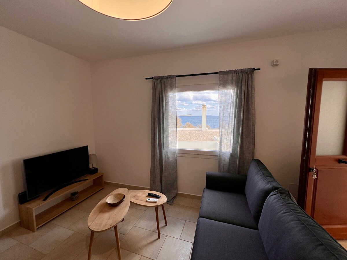 Apartamento de una habitación totalmente equipado con vistas frontales al mar. Una cama doble en el dormitorio, cocina totalmente equipada (horno, nevera-congelador, lavavajillas, 4 fogones), baño con ducha, lavadora, terraza privada con sillas y mesa. Acceso a un patio compartido con acceso directo al mar (rocas) donde los huéspedes pueden darse un baño matutino. Vista frontal al mar desde el salón y la habitación. A unos pasos del centro de Ermoupolis.