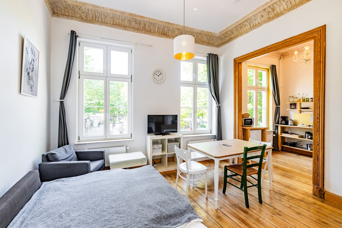 El apartamento-estudio (aprox. 30 m²) se encuentra en una planta superior de 400 m² de un edificio de caballería construido a mediados del siglo XIX junto con algunos estudios de artistas. Hay un aparcamiento gratuito disponible. El apartamento tiene su propio baño y una pequeña cocina americana. A unos 200 metros hay una parada de autobús con conexión directa a la ciudad.