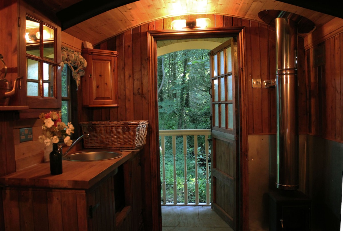 Bienvenido a nuestro encantador carromato, ubicado en un bosque privado. La cabaña está equipada con una cómoda cama doble con espacio para una cama de niño si es necesario. La ducha y el inodoro con descarga se encuentran dentro de una caseta de timón de barco reciclada a 30 metros de distancia. Si viajas como parte de un grupo más grande, consulta nuestros otros anuncios con habitaciones B&B disponibles dentro de la casa principal. Estamos ubicados justo a las afueras de la tradicional ciudad mercado de Mold.