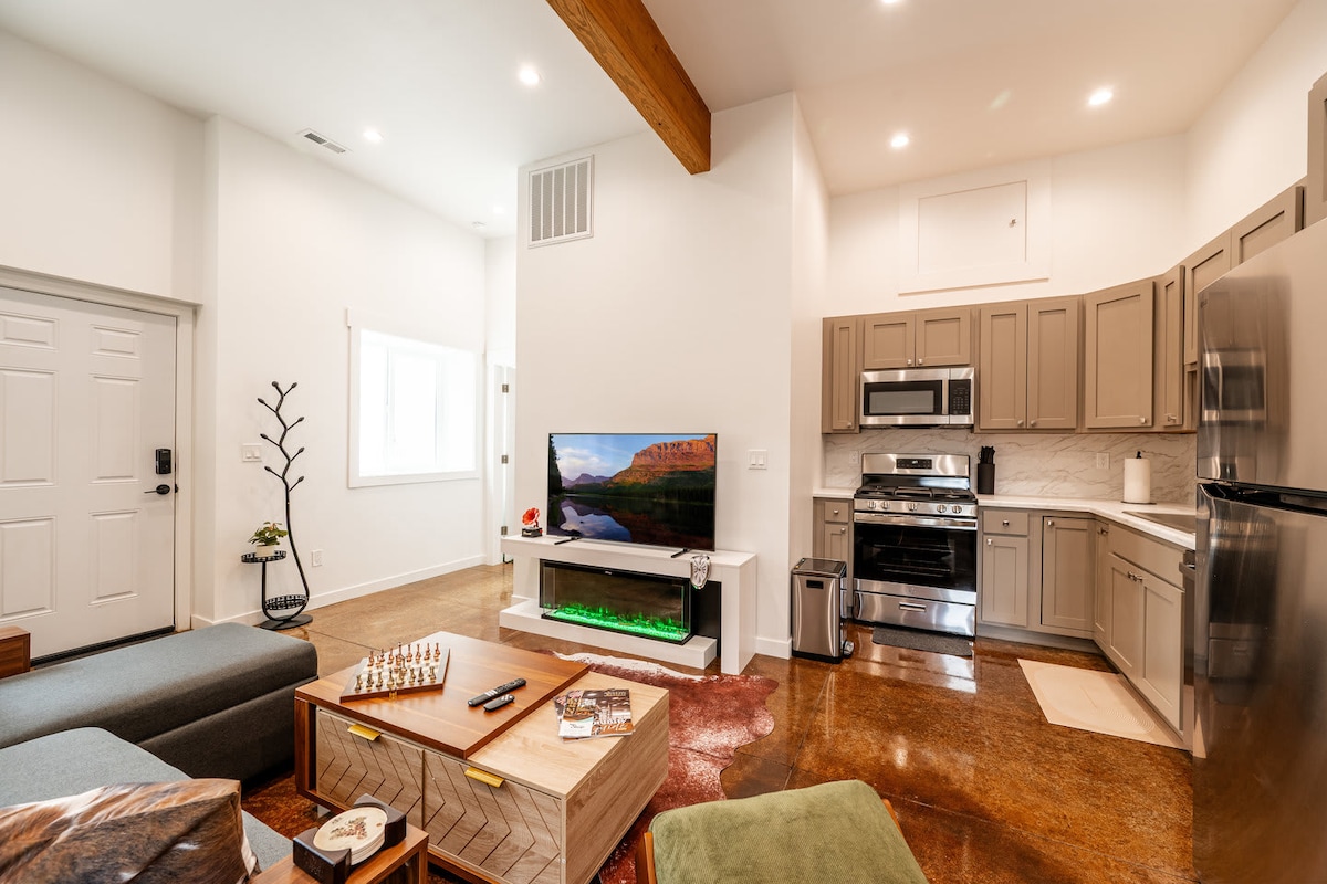 Con una ubicación céntrica y de nueva construcción, esta elegante casa de dos dormitorios es perfecta para parejas, familias o amigos. Cada dormitorio tiene una cama tamaño queen y su propio control de temperatura para una estancia personalizada. Disfruta de una noche acogedora con una comida casera y una película, o sal a asar malvaviscos junto a la fogata de gas. Las sábanas de lujo, los suelos calefactados del baño y las toallas de felpa añaden un toque de lujo, mientras que dos bicicletas cruiser están disponibles para explorar la ciudad a tu propio ritmo.