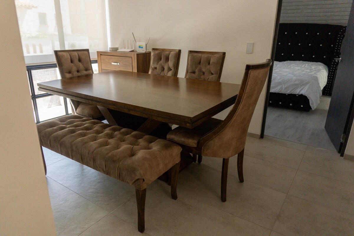 Un departamento residencial con mucho estilo ideal para disfrutar con tu familia, dentro de un exclusivo residencial con alberca. ••SI FACTURAMOS•• Cuenta con áreas comunes como alberca,dog park, ajedrez gigante, canchas de fut bol, juegos infantiles, etc. IMPORTANTE: Para el uso de alberca se debe solicitar las pulseras antes del inicio de la reservación. NO ofrecemos el servicio de aire acondicionado, lavadora o secadora.