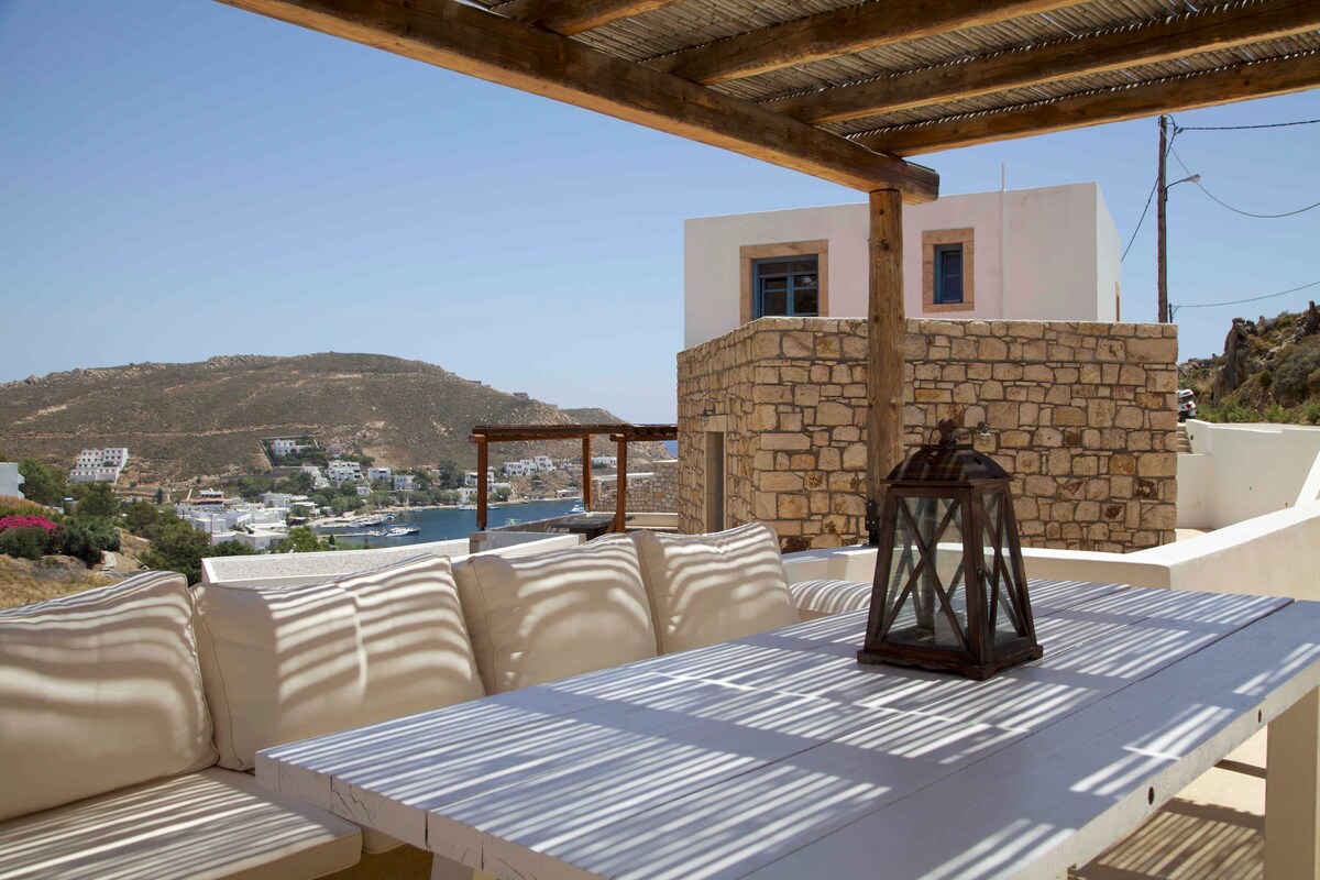 Elegante casa de dos dormitorios con vistas al mar para un máximo de 4 huéspedes, que combina encanto tradicional con comodidad moderna. Spa con piscina privada, hammam aromático y amplias terrazas con vistas panorámicas al puerto de Patmos y Chora. Ideal para parejas o familias pequeñas que buscan relajación y privacidad.