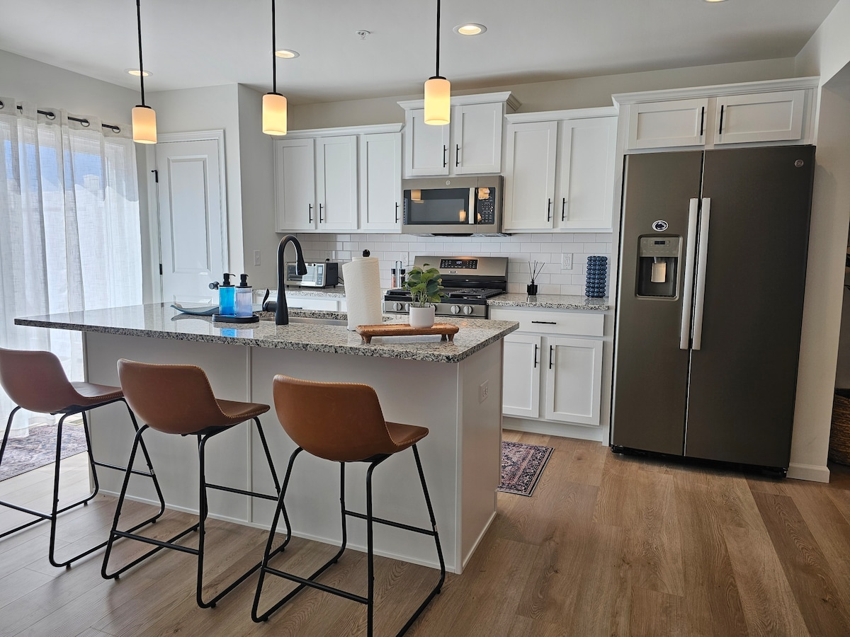 Discover your perfect State College retreat! This modern 3-bedroom townhouse comfortably fits 6 guests, with a King bed and dedicated workspace in each room. Ideal for game weekends or work trips, it features a full kitchen, fast Wi-Fi, and a private patio. Located just a short drive from North Atherton's dining and shopping, with easy access to I-99 and free covered parking.