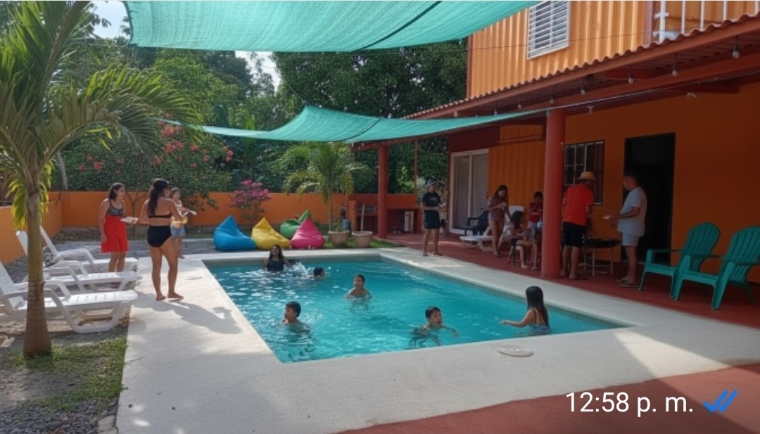 Santa Fe de Lajas en Chame, Provincia de Panamá oeste una casa vacacional, que te permite conectarte con la naturaleza y pasar ratos de esparcimiento solo o en familia. La casa tiene una capacidad para 10 personas. Cuenta con tres habitaciones, cada una con su baño privado. Cocina, sala, comedor, una habitacion para trabajar, piscina, terraza techadas, jardín al aire libre y área de BBQ. Servicios de Wifi y televisión. Accesibilidad a las playas del área, centros comerciales, montañas etc.
