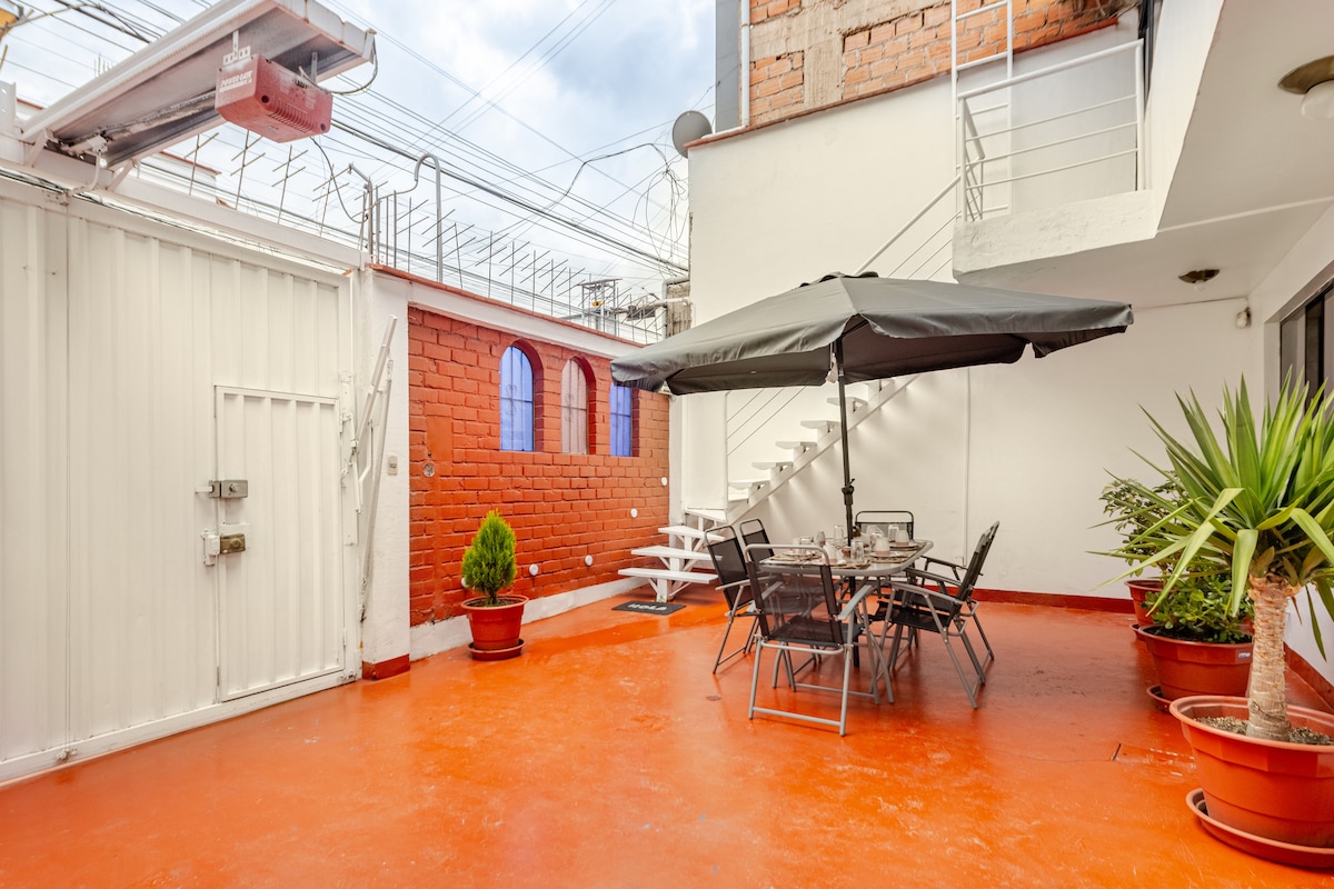 Gran casa de más de 400 m2 con 5 amplias habitaciones. 4 de las habitaciones con baño propio cada una. Ademas de espacios muy amplios y cómodos para pasarlos en familia o con amigos. Idóneos para reposar con el calor de una chimenea o salir al patio trasero a disfrutar de una parrilla. Siempre con acceso a wifi. Cuenta con una gran cochera en caso tengan vehículo. Ubicación perfecta, céntrica pero tranquila y segura en Miraflores a dos cuadras del parque Kennedy.