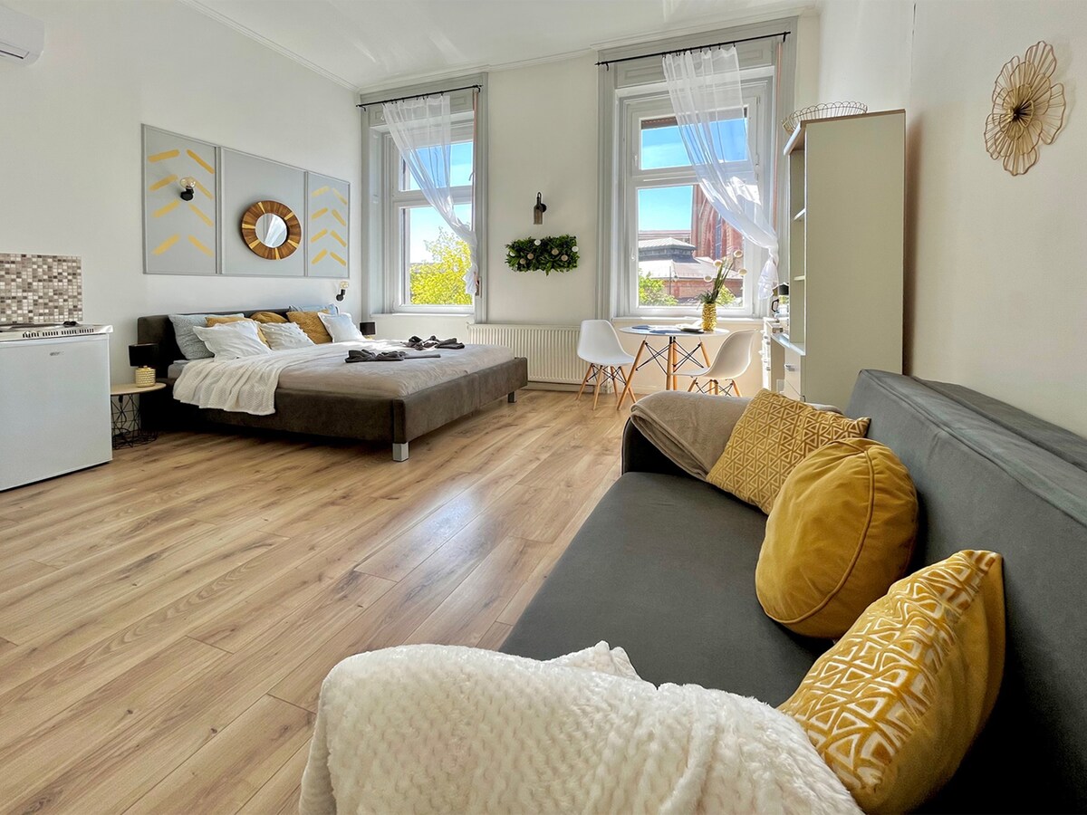 Ubicación excelente! Estudio renovado en el Centro, con vistas al Mercado Grande, junto al Danubio y al lado de la famosa calle peatonal Váci. Tenemos 4 estudios modernos completamente separados uno al lado del otro con cama King-size + cama extraible, cocinita propia, bano privado en-suite con ducha y aseo, TV, wifi rapido y aire acondicionando gratuito. Plus un lobby / cocina común bien equipada + lavadora, secadora. El Rió Danubio, restaurantes, cafeterías, tiendas, metro a un minuto a pie