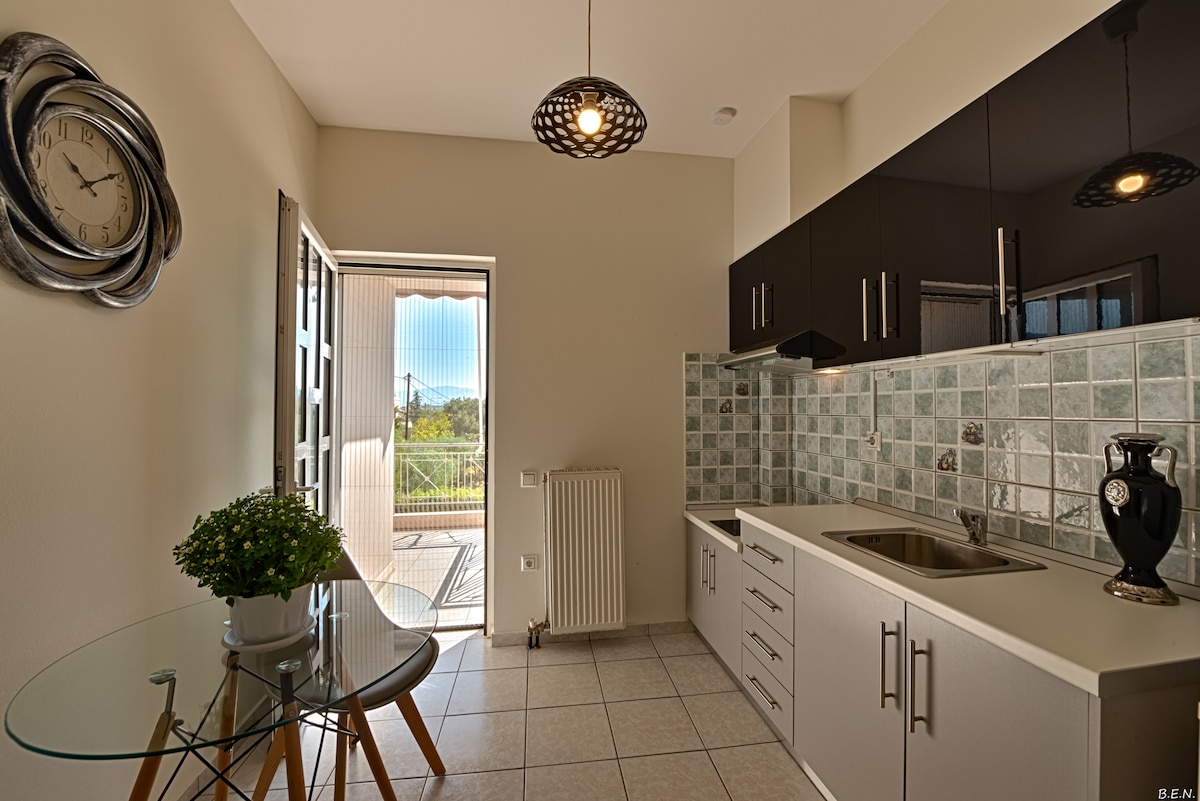 Disfruta del sol y de la puesta de sol sentado en la sala de estar. ¡Un retrato de una vista increíble en un apartamento acogedor! Una ubicación ideal, a solo 2 km del centro de la ciudad, que te proporcionará relajación. (110 m2) Cerca de hermosos restaurantes con cocina griega y mediterránea y cafeterías te esperan para un descanso. La playa con increíbles aguas azules está muy cerca y se puede acceder a ella a pie o en transporte local.
