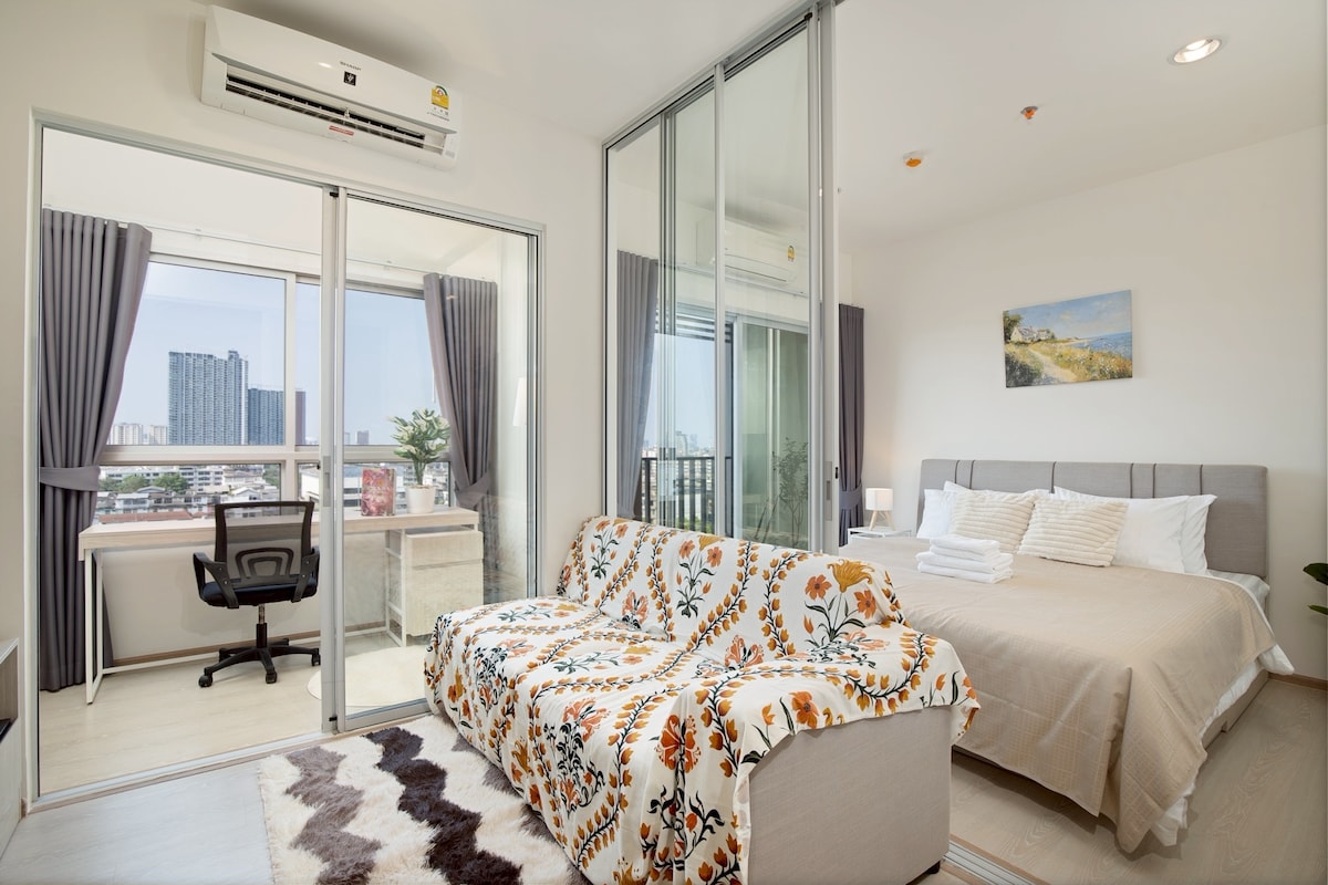 Disfruta de la comodidad y el estilo en este acogedor apartamento de 30 metros cuadrados con impresionantes vistas al río Chao Phraya y al bosque de manglares. Disfruta de impresionantes puestas de sol desde tu balcón privado y de la comodidad de estar a pocos pasos de BTS Chang Erawan (E17), conectándote con el centro de Bangkok en cuestión de minutos. Las joyas locales, incluidos los vibrantes mercados nocturnos, un 7-Eleven, un salón y una farmacia, están a la vuelta de la esquina. A unas paradas de BTS, encontrarás supermercados y centros comerciales para todas tus necesidades :)