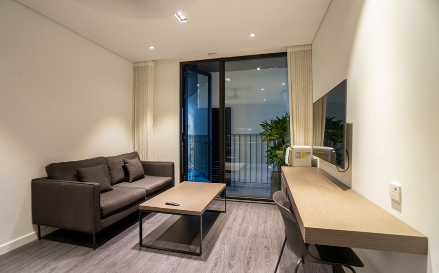 Este hermoso apartamento en Tay Ho se encuentra en el sexto piso de nuestro nuevo edificio: Hanoi Housing 32. Tiene un dormitorio, un baño y una sala de estar-cocina abierta. Está muy bien diseñado. Se proporcionan muebles y equipos modernos completos. El suelo de madera ayuda a que el apartamento sea fácil de limpiar. Además, la ubicación del edificio está a poca distancia a pie de tiendas de comestibles, restaurantes, tiendas, bares y pubs. Ten en cuenta que no hay luz natural ni balcón en el apartamento.